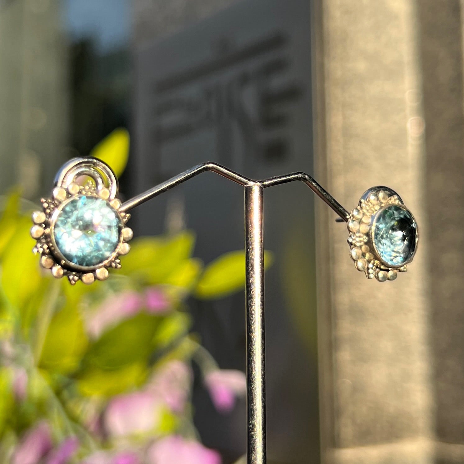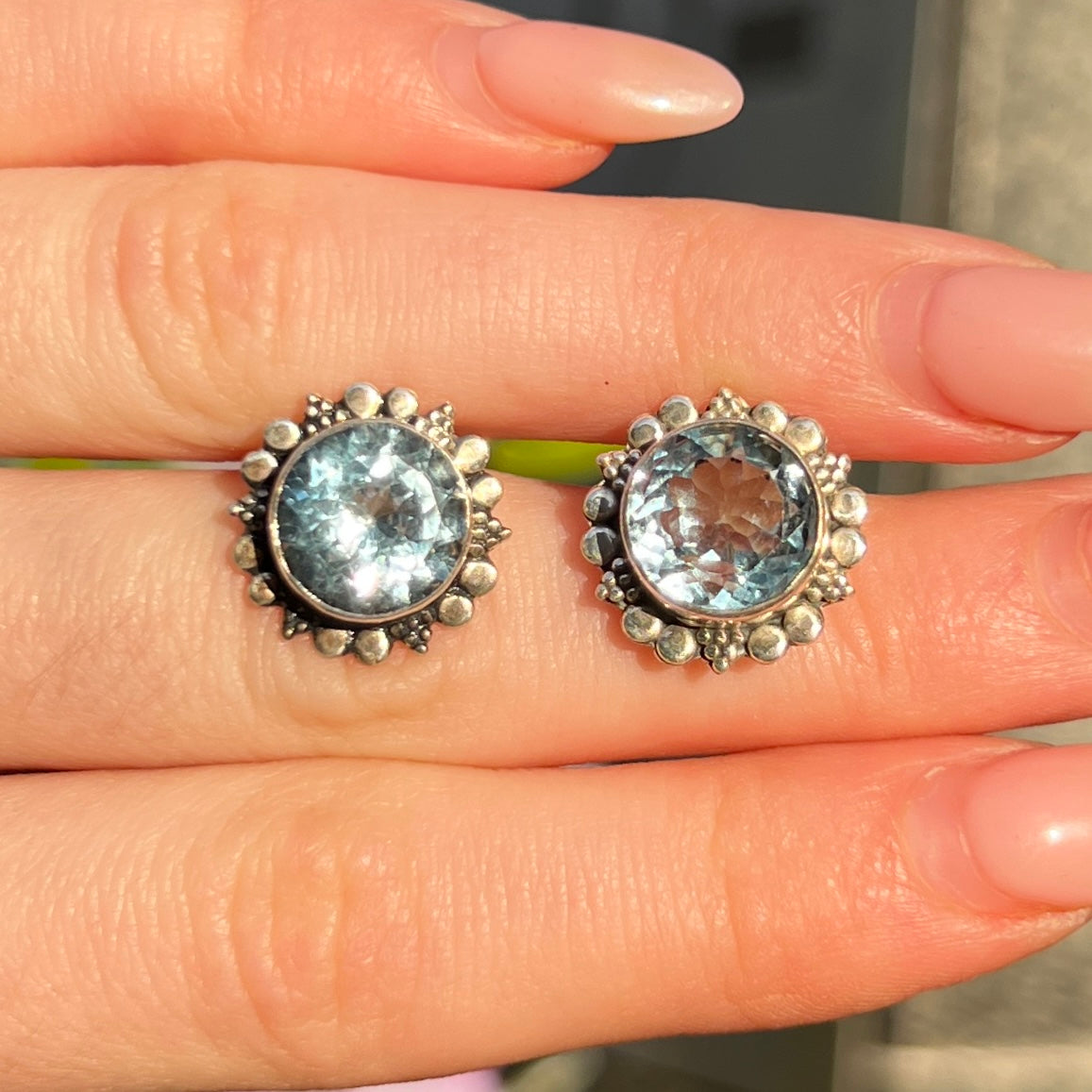 Round cut pale blue topaz faceted stones, bezel set into sterling silver sun design stud earrings.