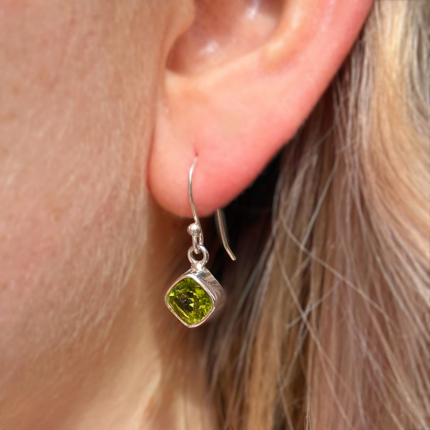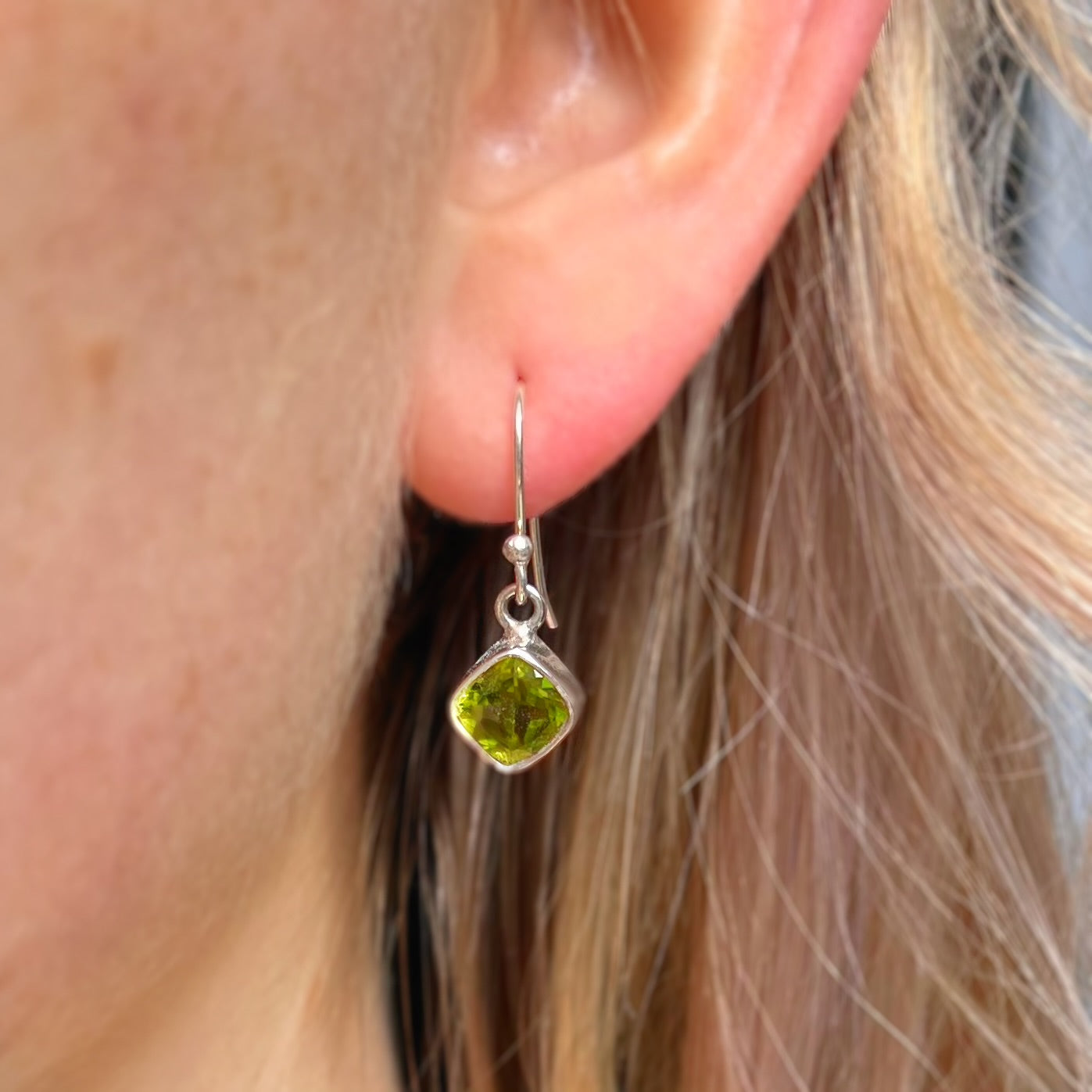 The classiest earrings, featuring fresh lime-green, cushion-cut natural peridot gemstones, bezel-set in bright sterling silver.
