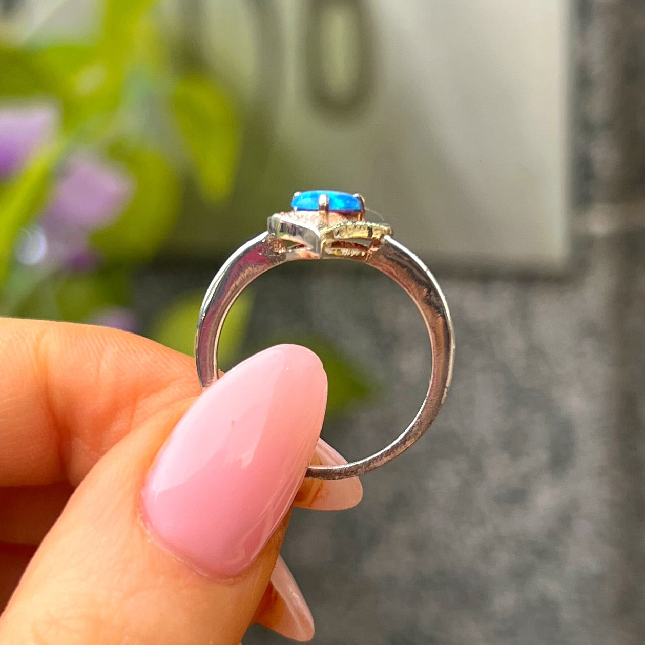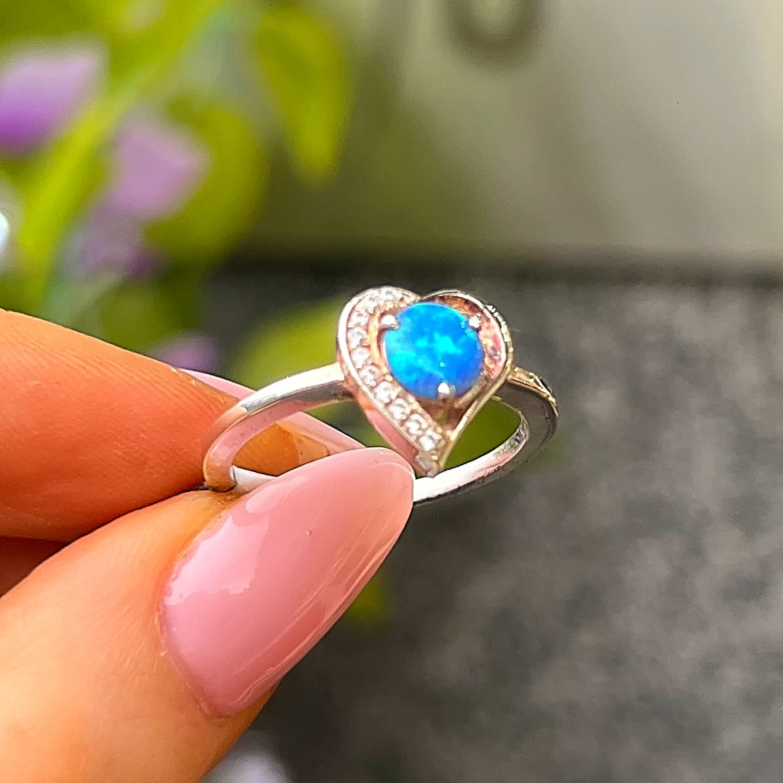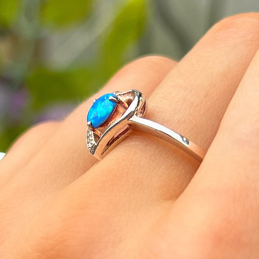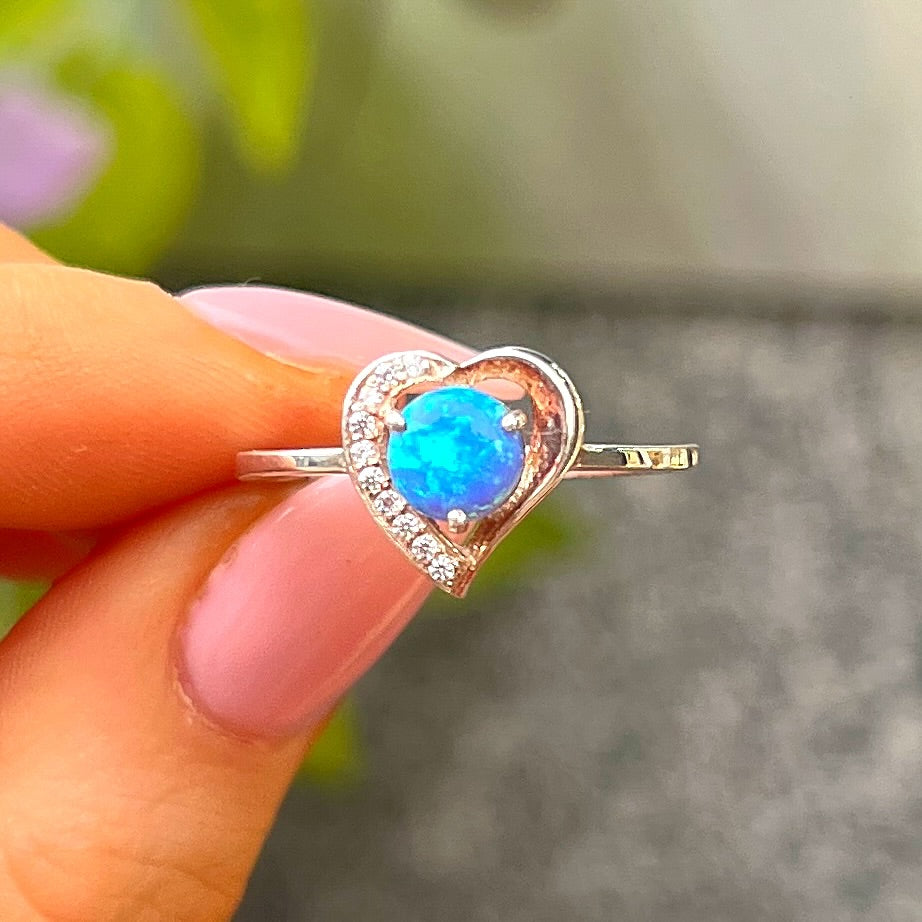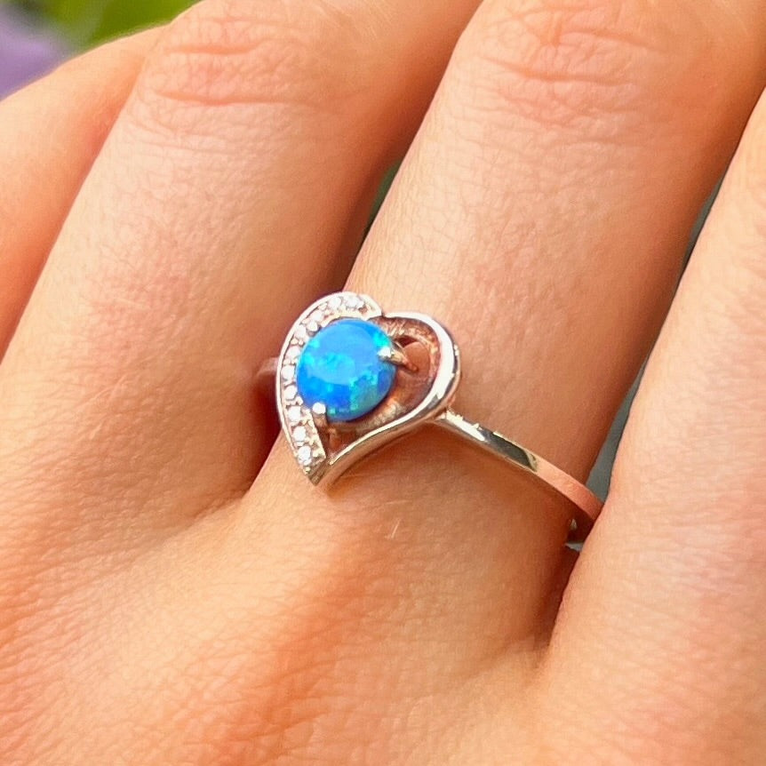 Sterling Silver Heart Design Blue Opal & Cubic Zirconia Ring - Size O