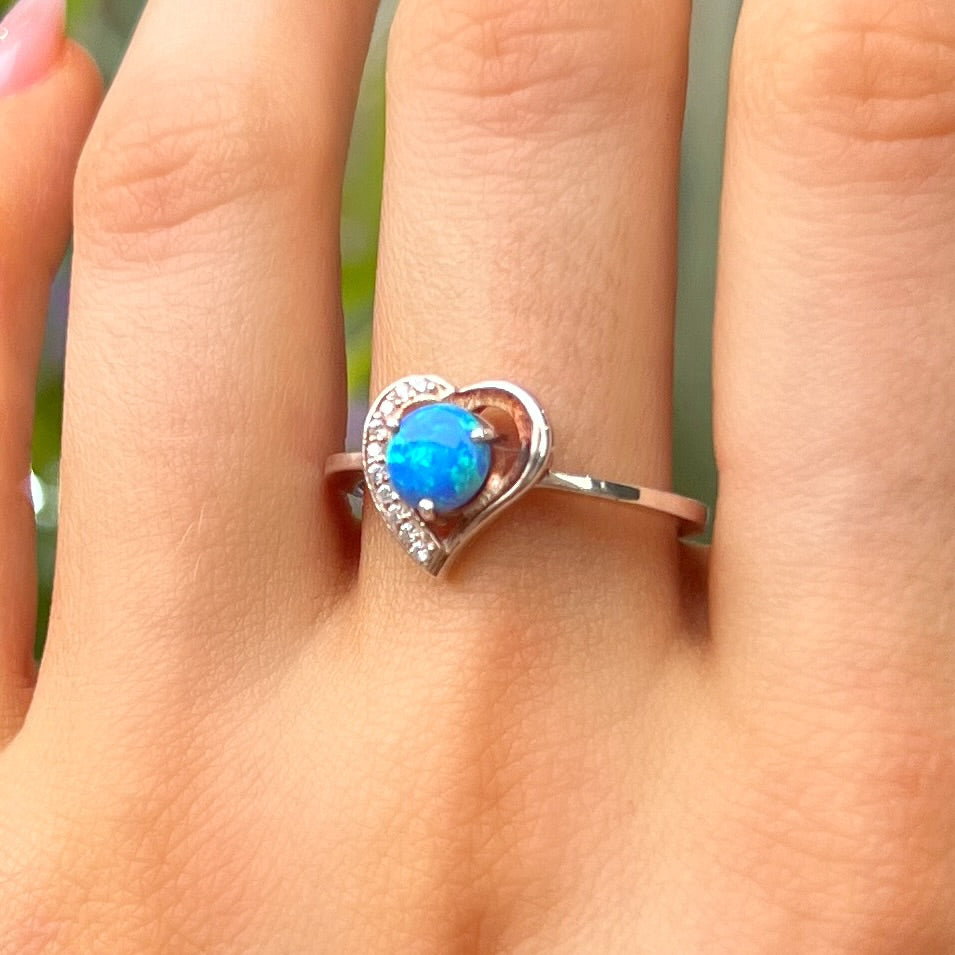 This sweet ring features one bezel set blue cabochon opal alongside clear cubic zirconia stones and set in a sterling silver heart design.