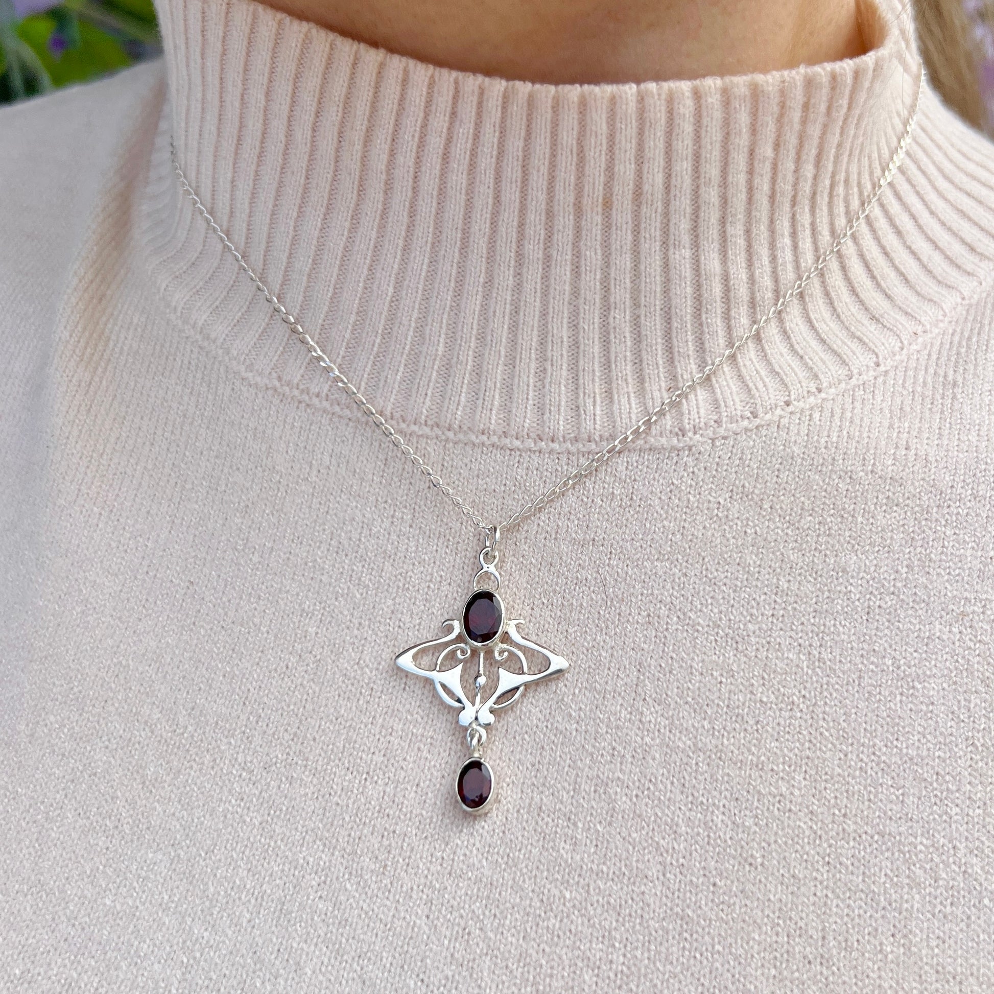 Sterling Silver Garnet Art Nouveau Inspired Necklace