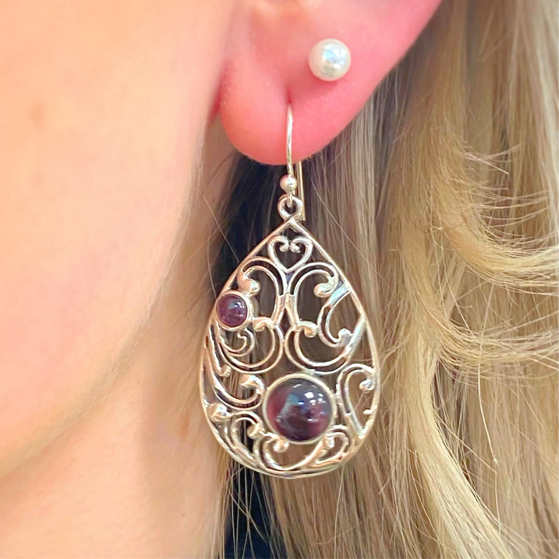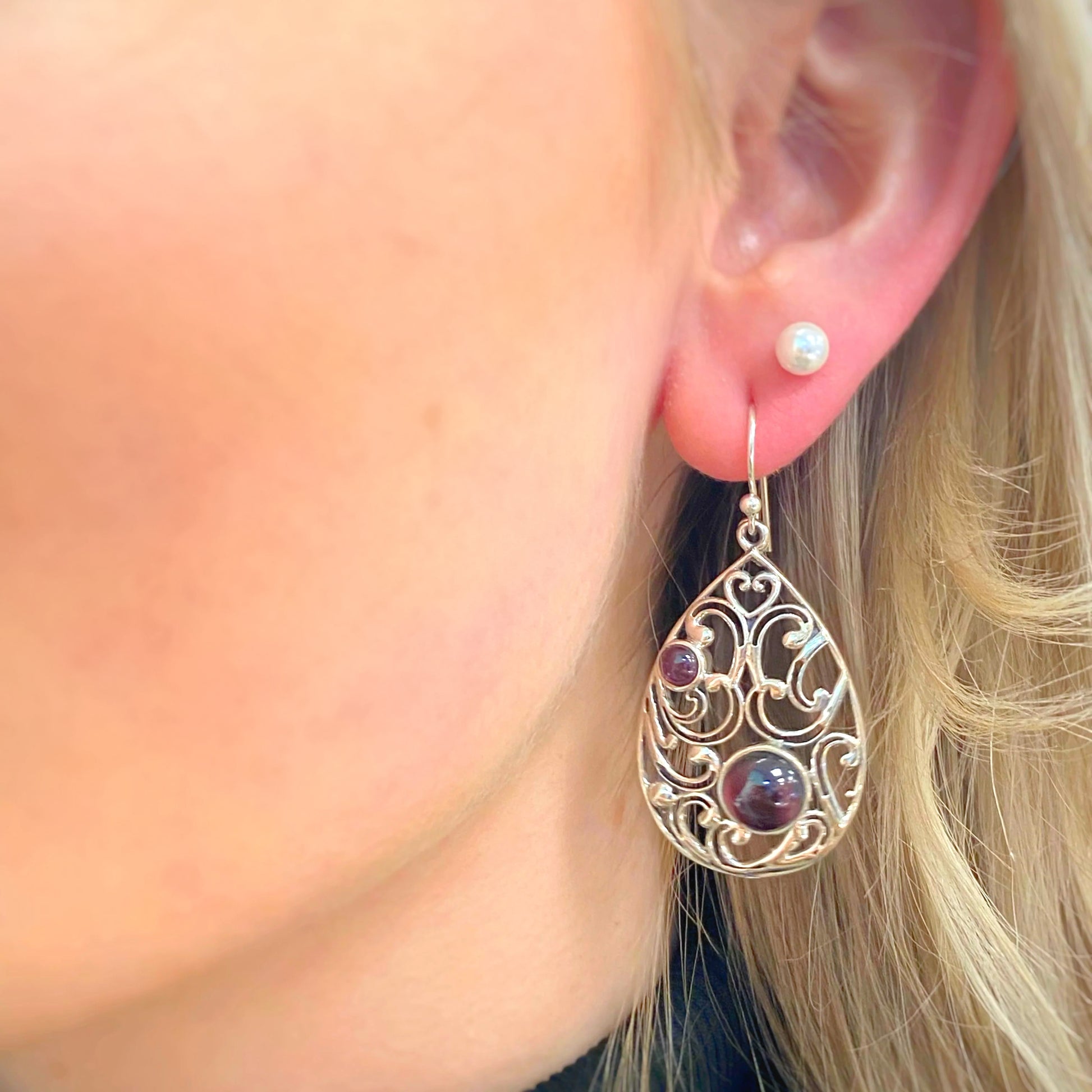 Sterling Silver Red Garnet Organic Style Drop Earrings