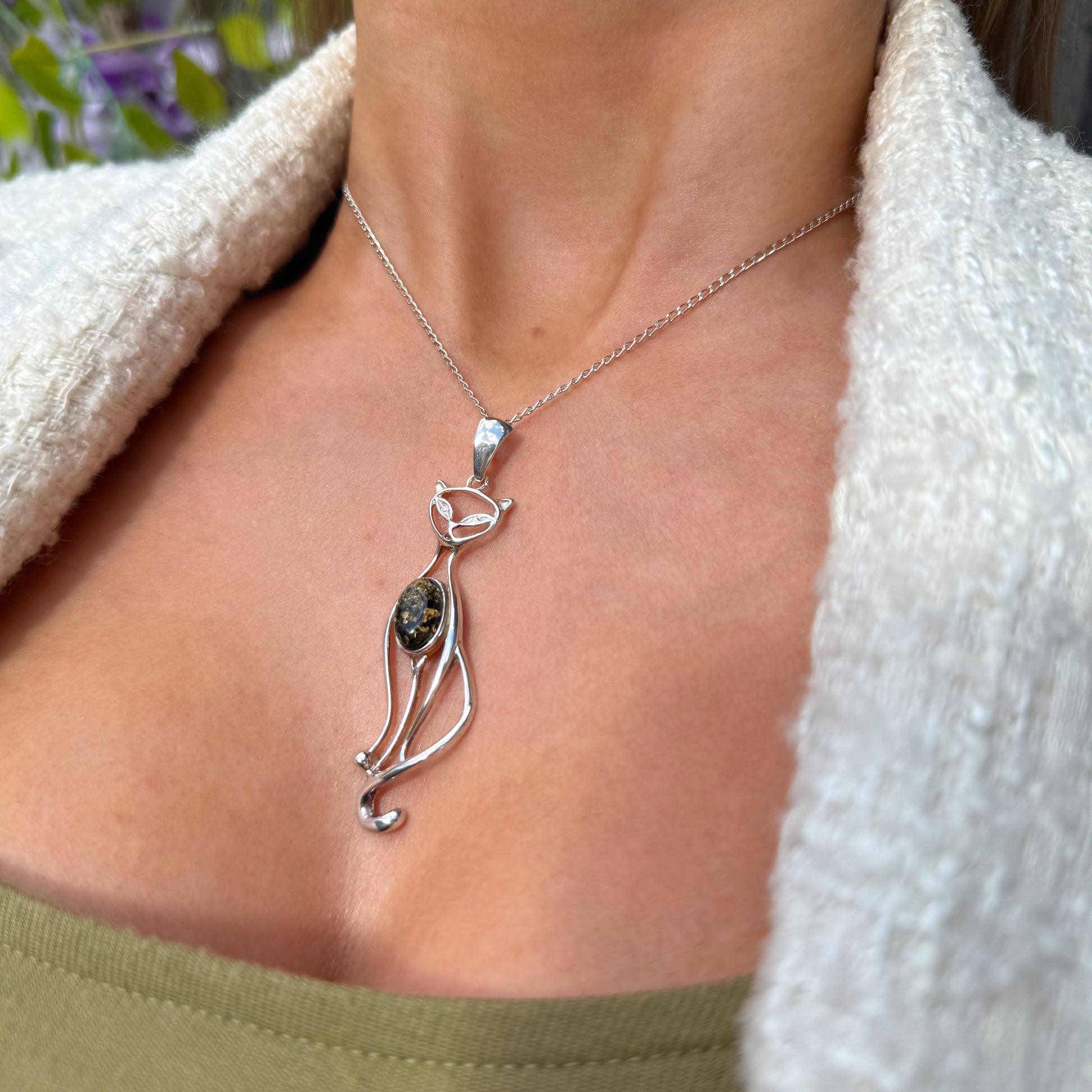 This adorable stylised cat necklace features one oval cut cabochon green amber stone, bezel set into a lightweight, sleek, sterling silver design.