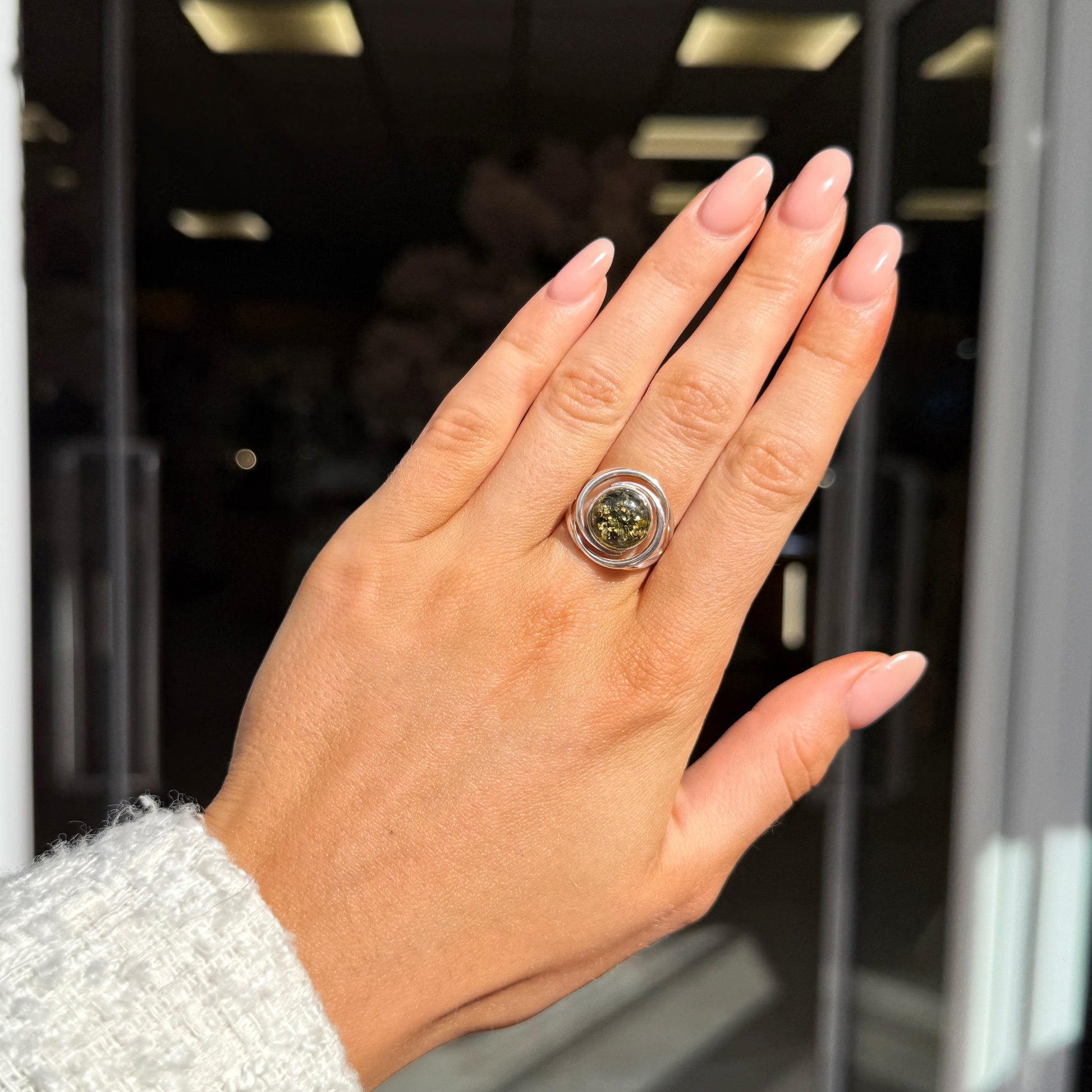 Green Amber Sterling Silver Round Spiral Ring - Size M