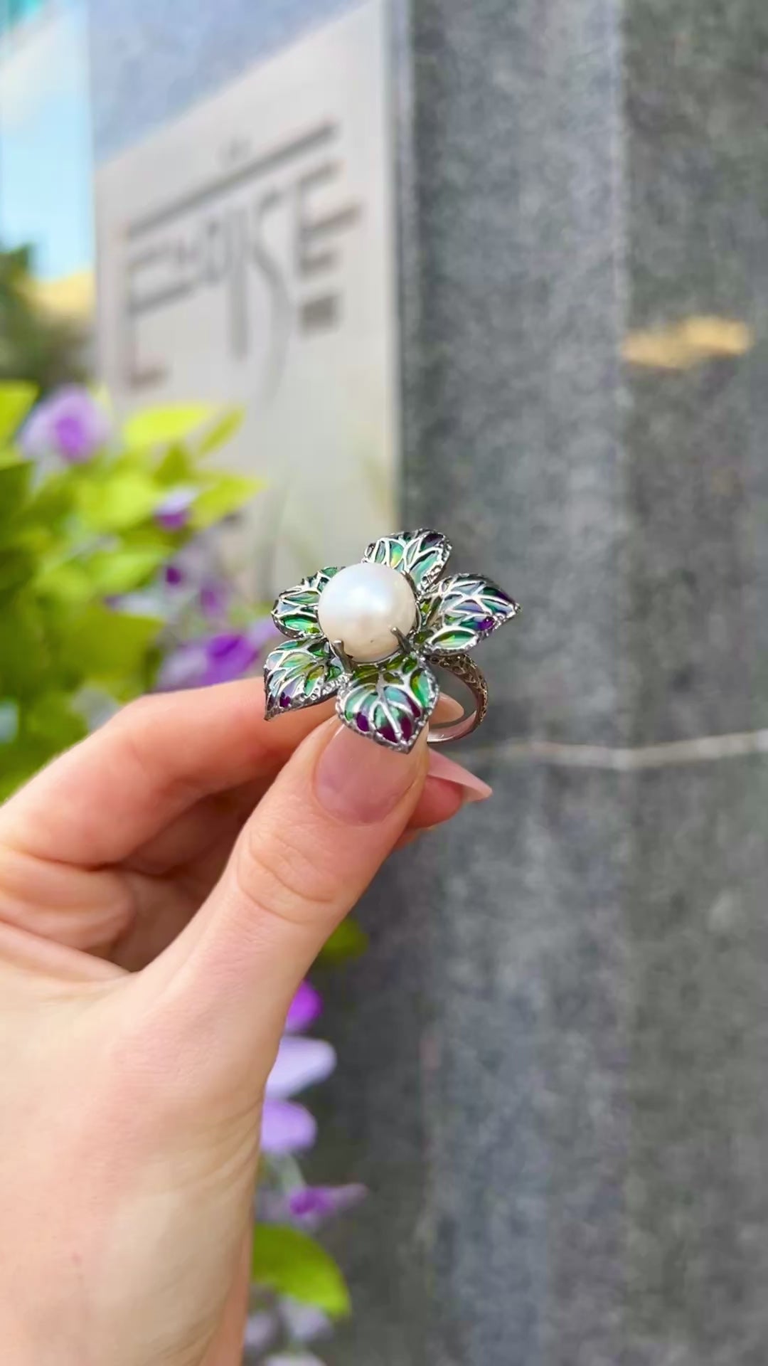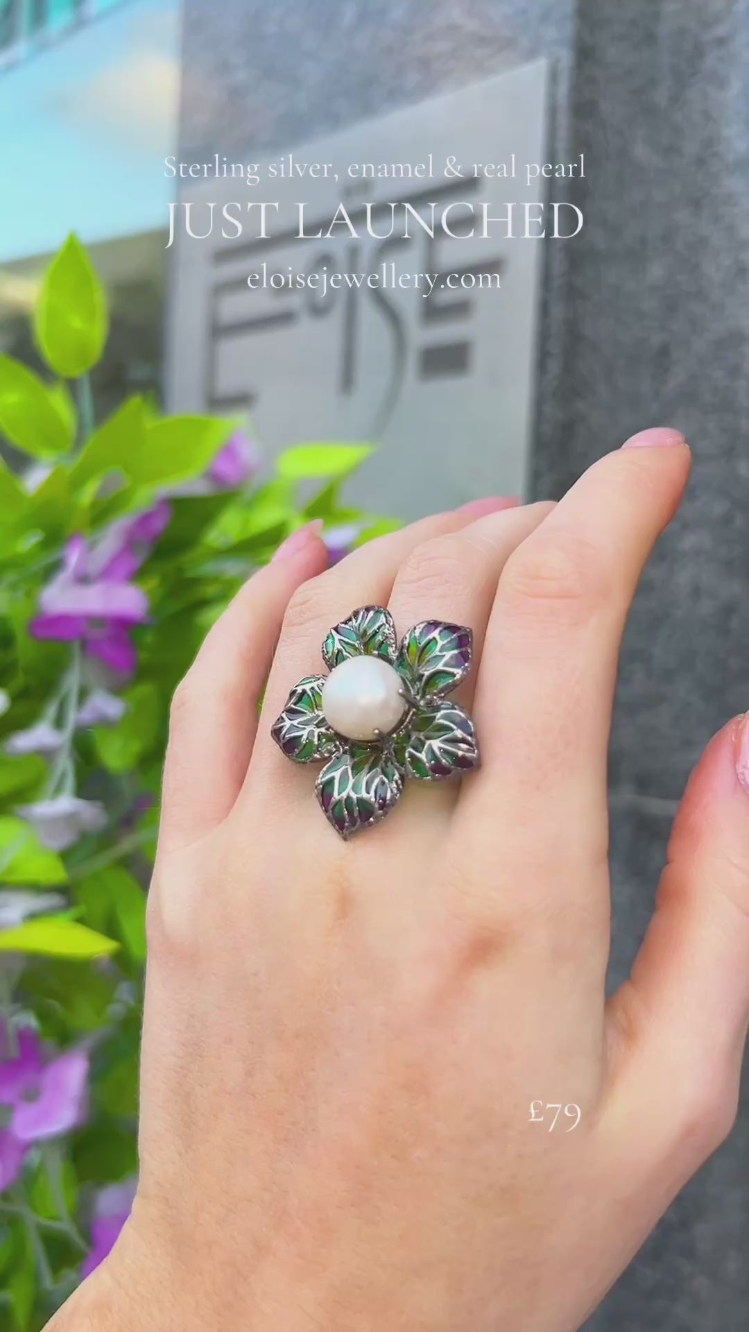 This incredibly unique statement ring features bright green and purple enamel, almost like a stain glass window across the petals of a 3D flower design. In the centre sits a large white freshwater pearl, all set in sterling silver.