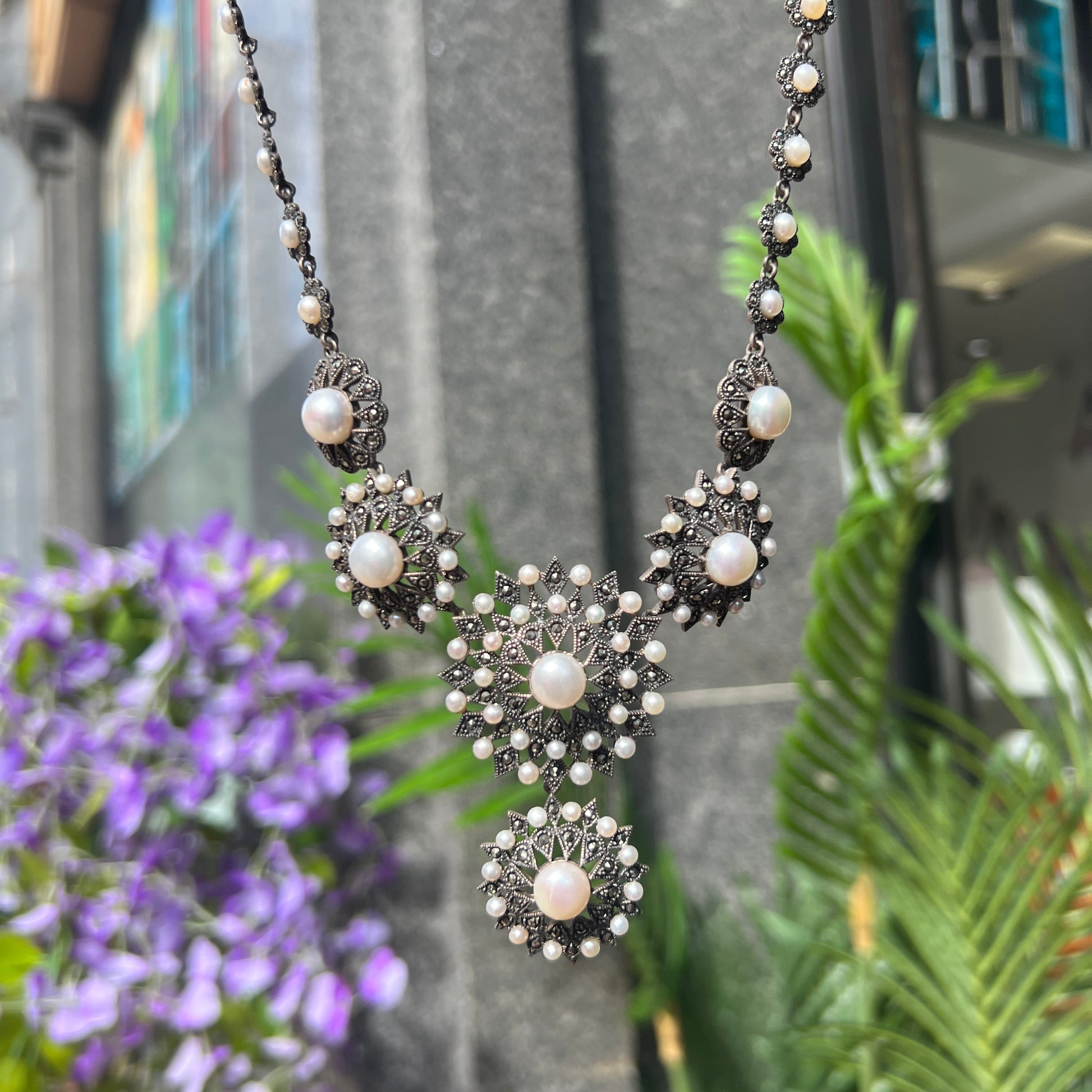 Sterling Silver Marcasite & Pearl Chunky Statement Necklace