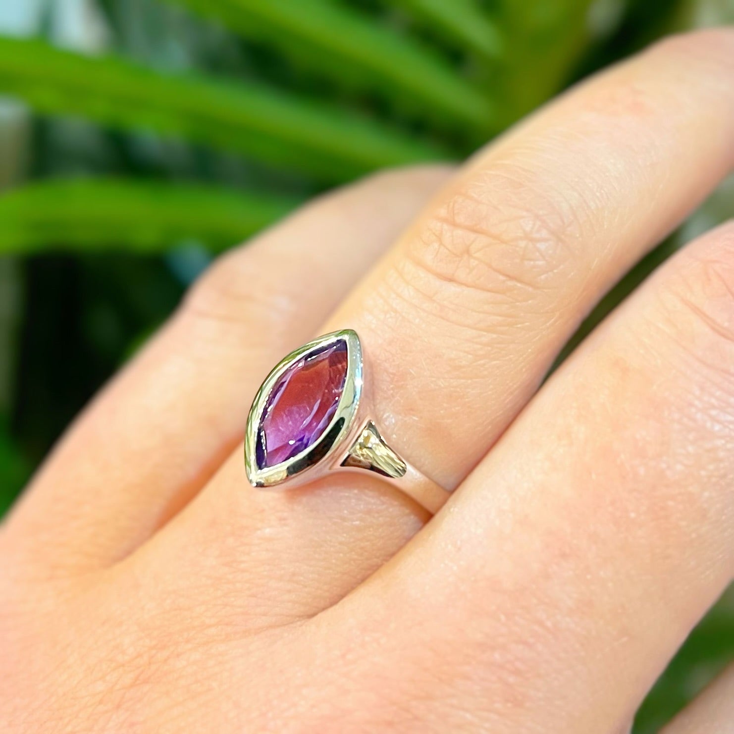 This classic ring features a deep purple, marquise-cut faceted amethyst, expertly bezel-set in shining sterling silver for a secure and chic finish.
