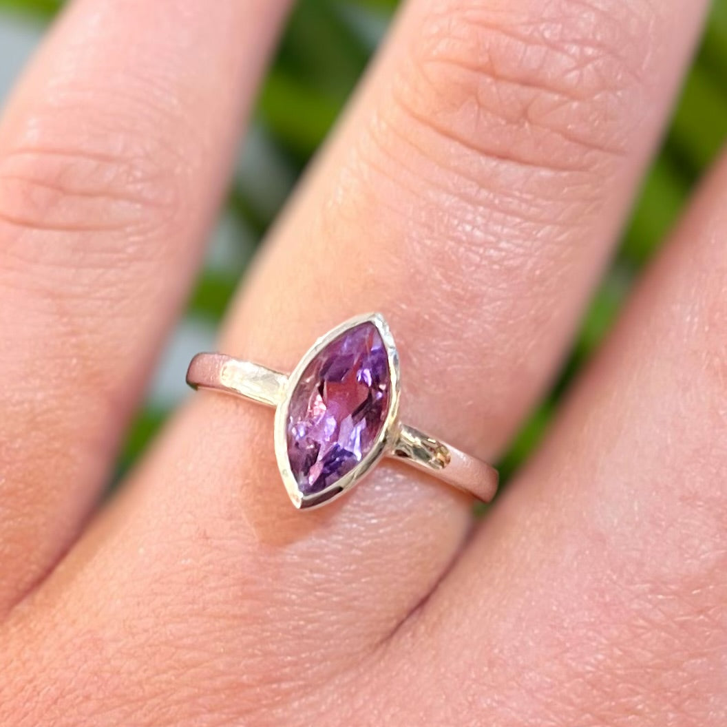 Made in timeless sterling silver, this stacking-style ring features a pale lilac marquise-cut faceted amethyst, bezel-set on a plain thin band for a pretty yet minimalist finish.