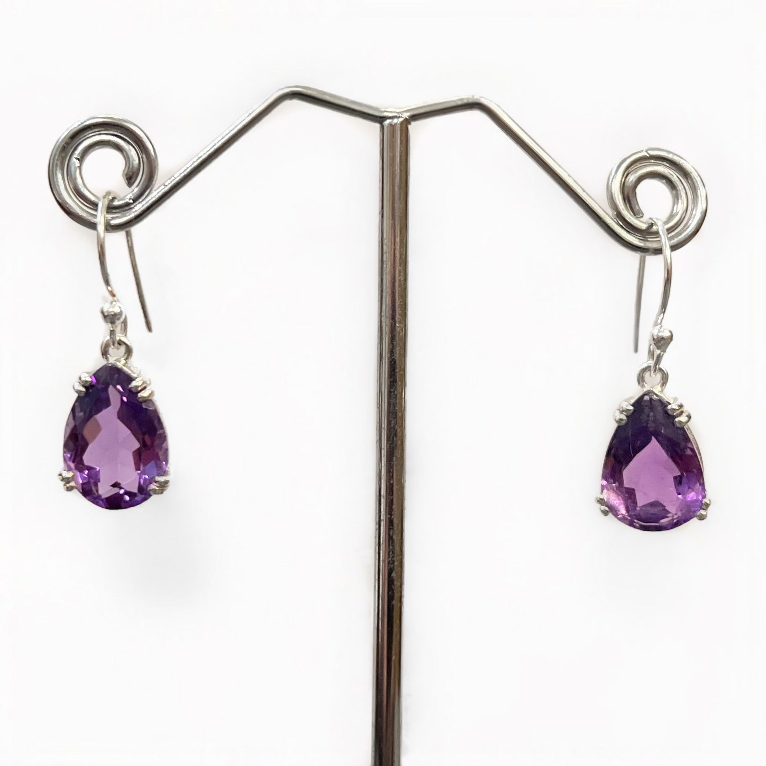 Made in sterling silver, these classy earrings feature pear-shaped, deep purple faceted amethyst gemstones, expertly claw-set into a simple drop earring design.