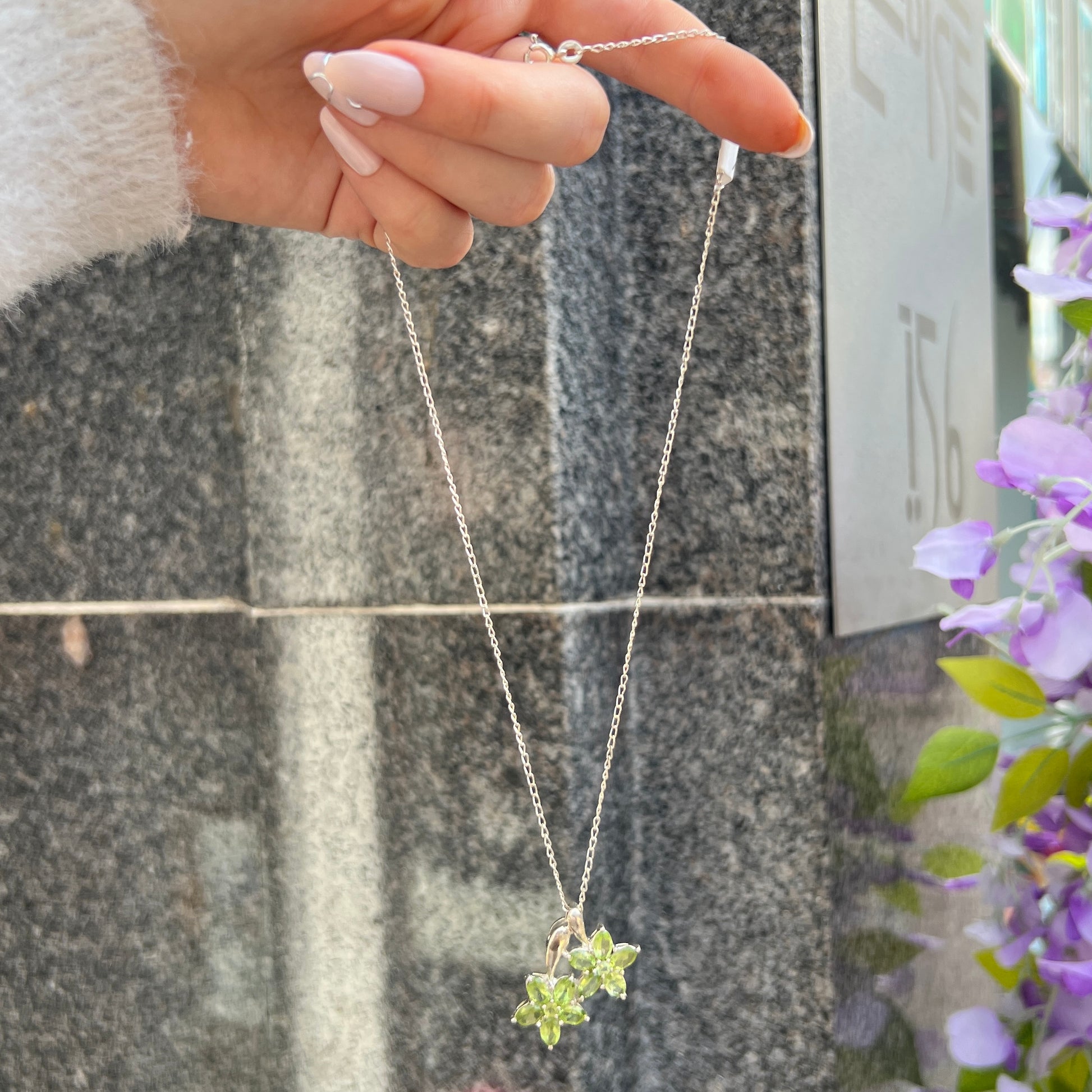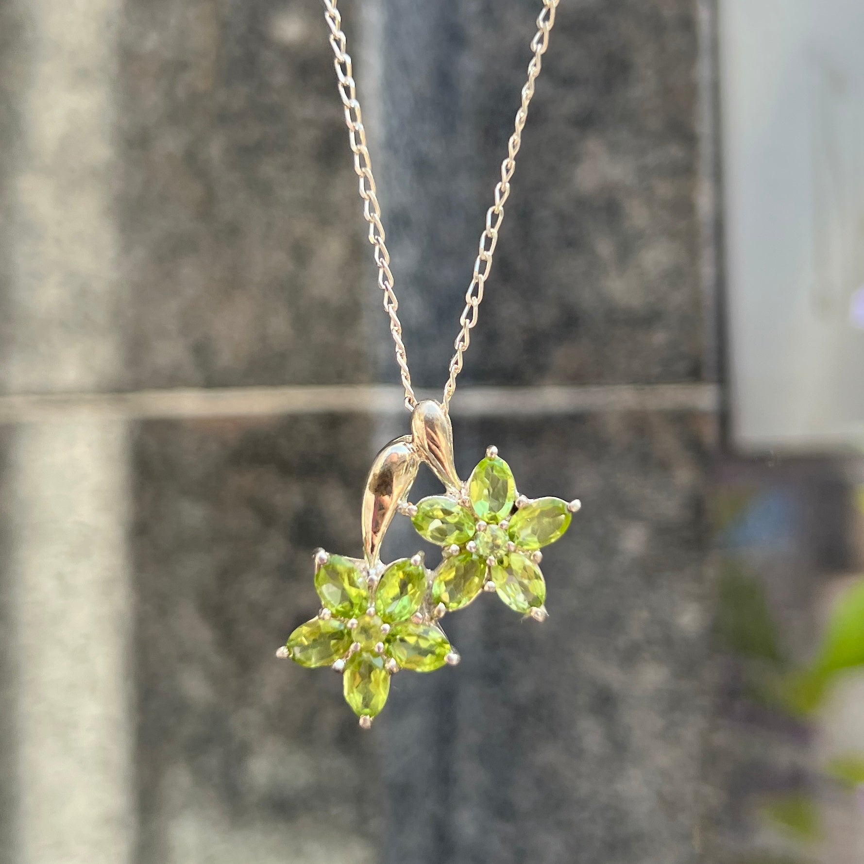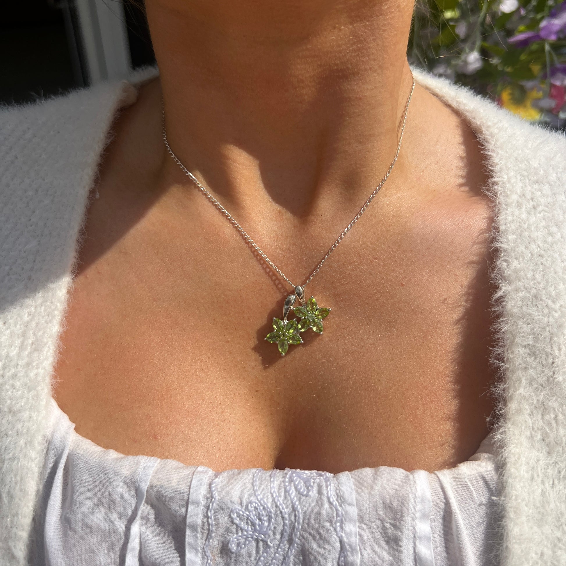 This sweet sterling pendant features twelve faceted claw set peridots in a floral design on a sterling silver 16” chain with extension chain.