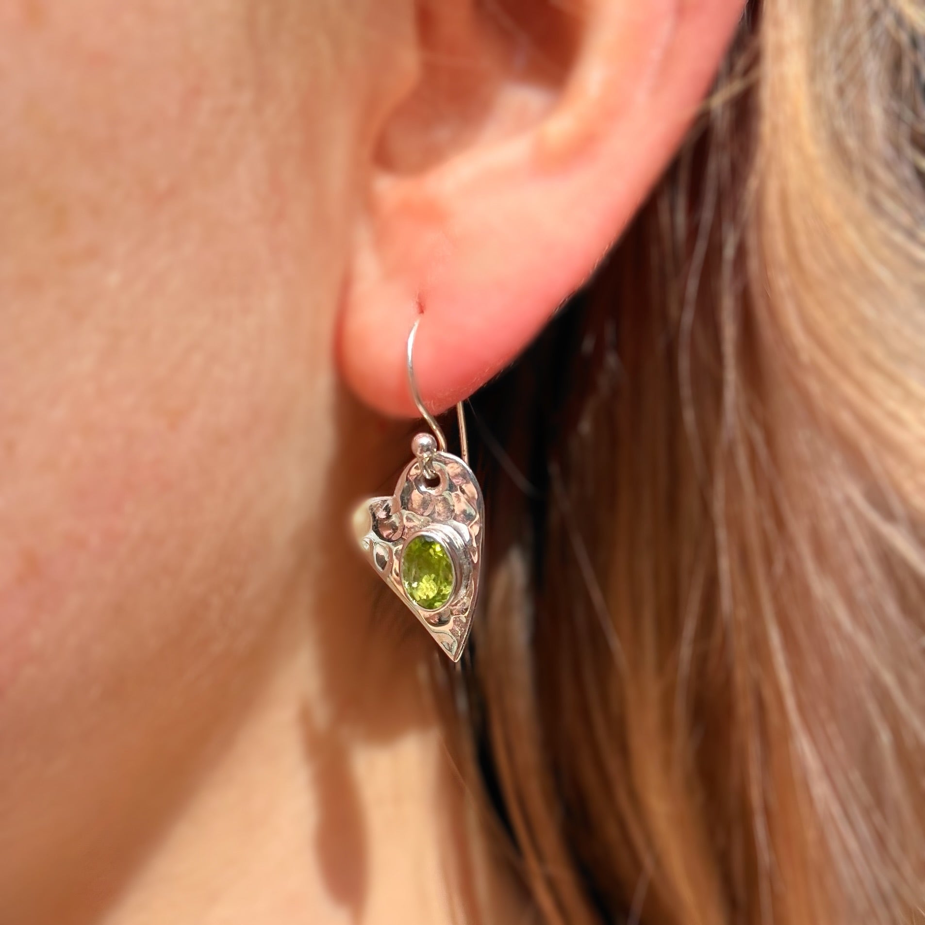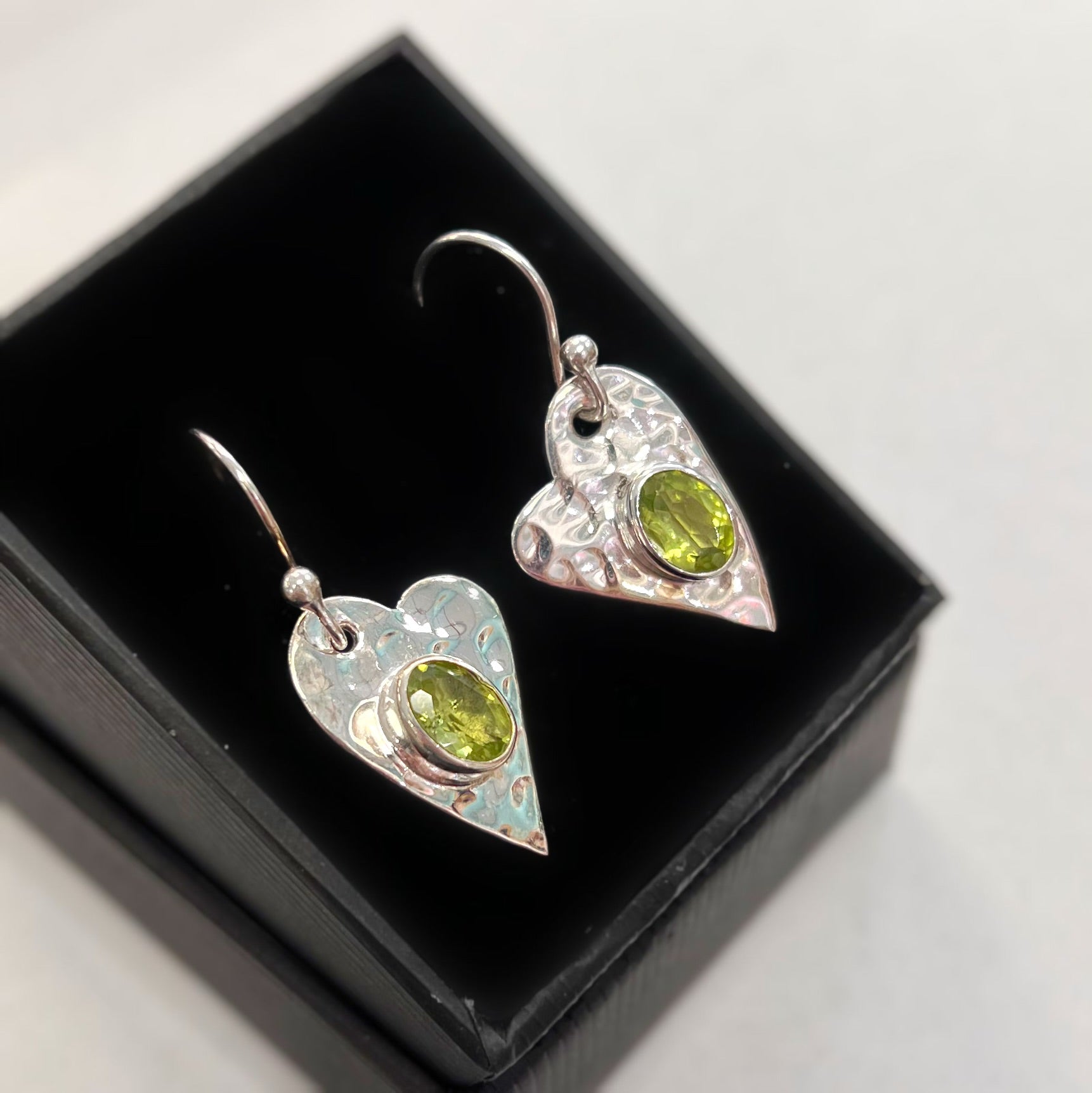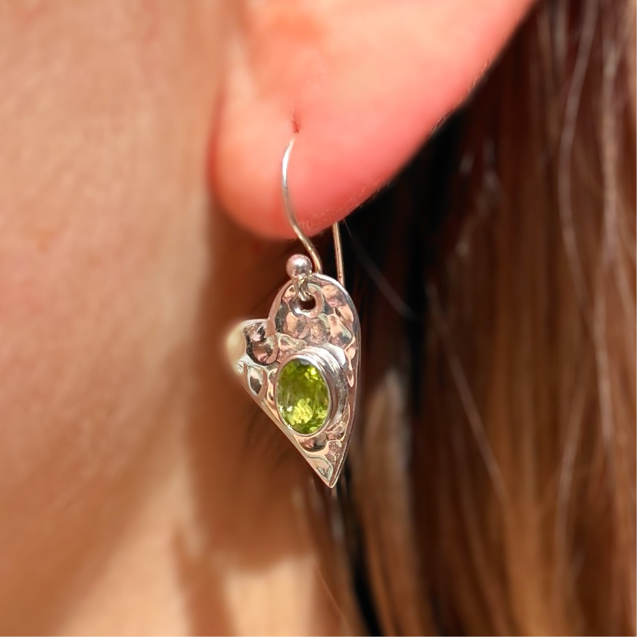 Sterling Silver Peridot Hammered Heart Drop Earrings