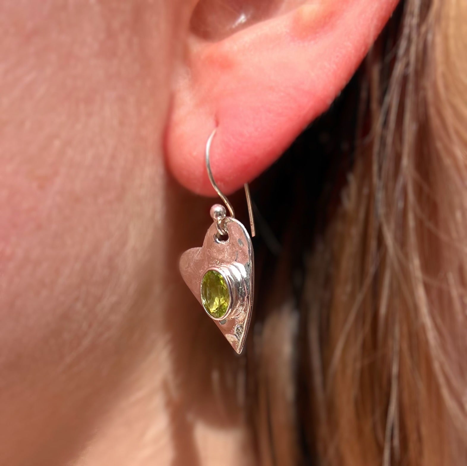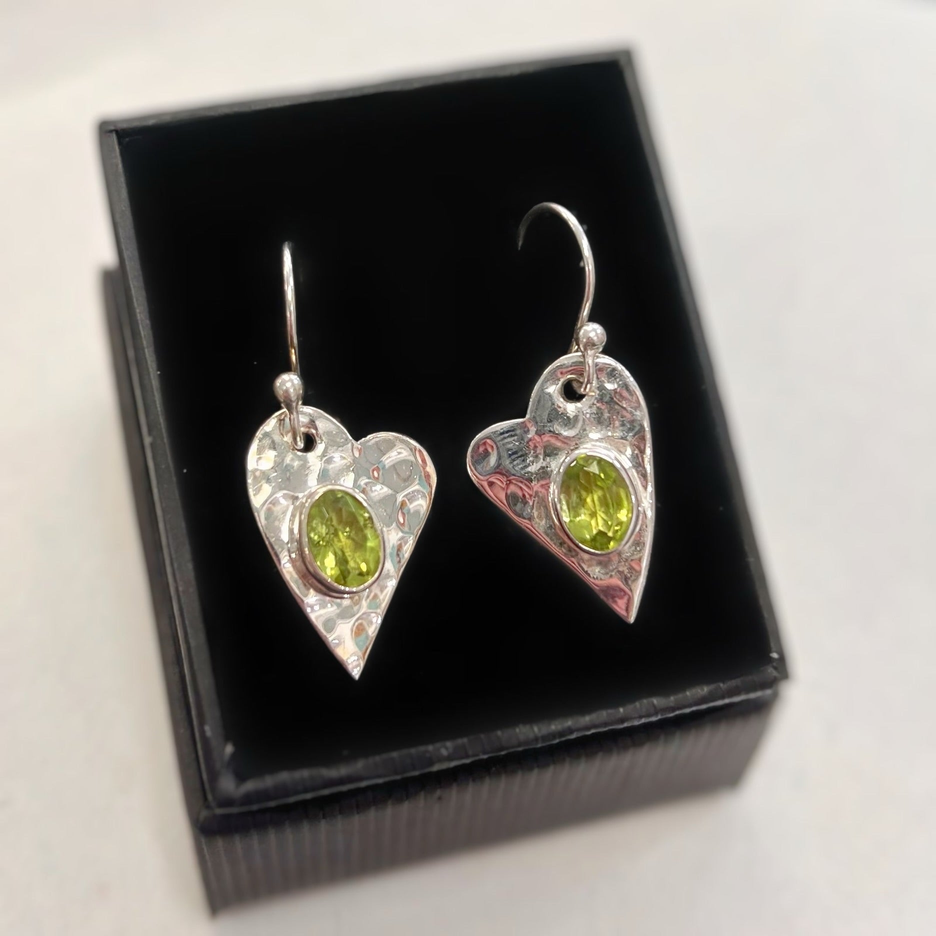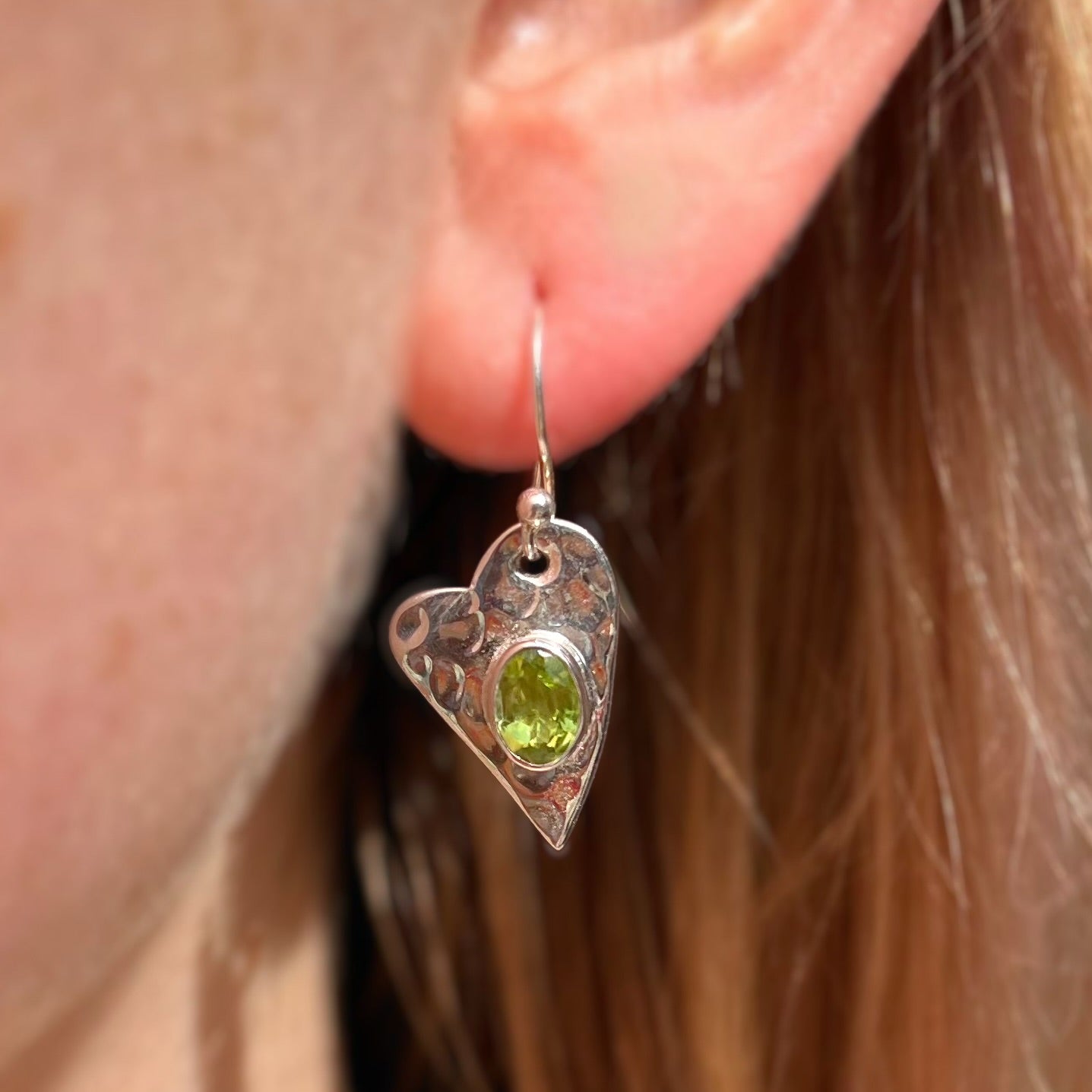 Sterling Silver Peridot Hammered Heart Drop Earrings