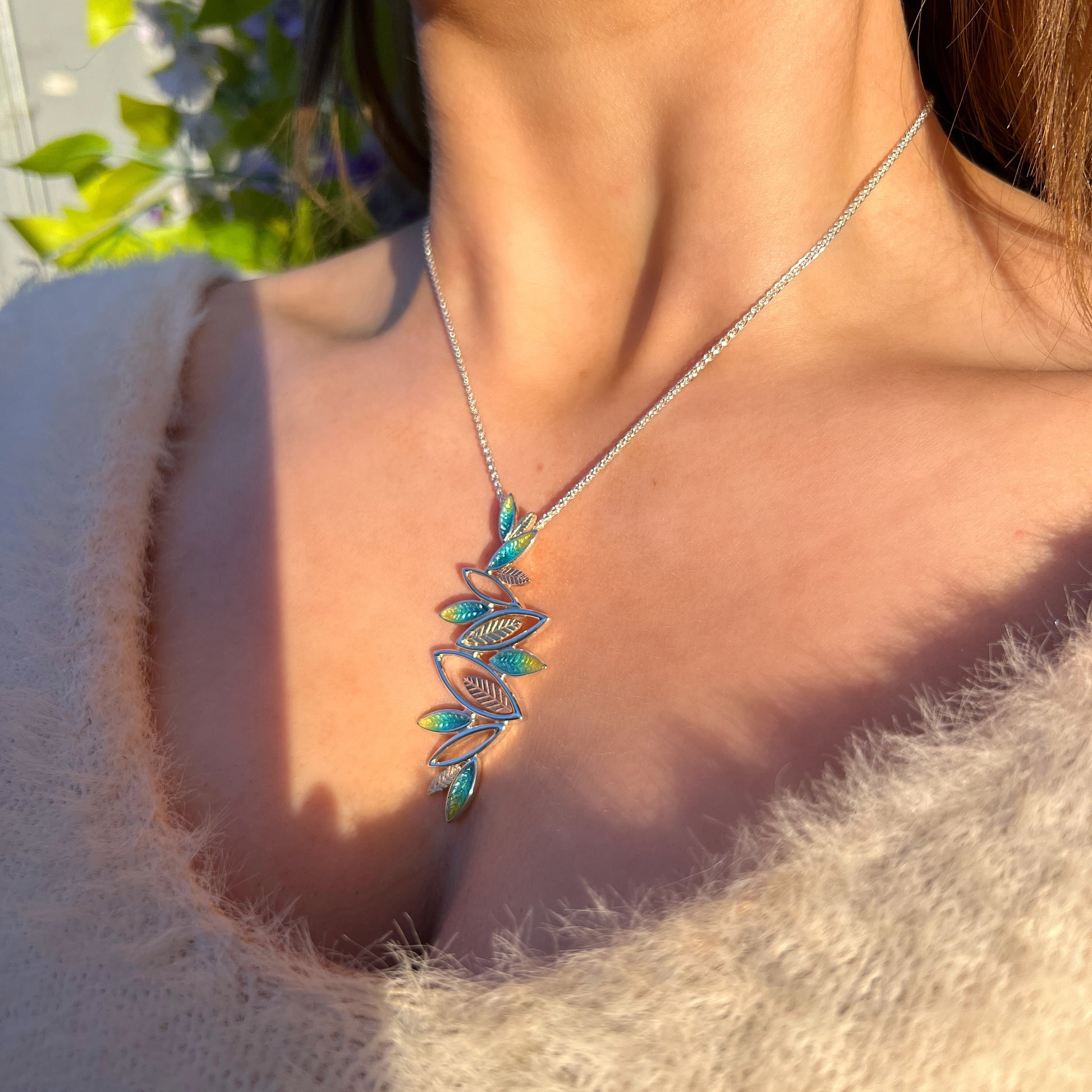 This striking necklace features a blue & green enamel leaf design, all crafted in sterling silver.