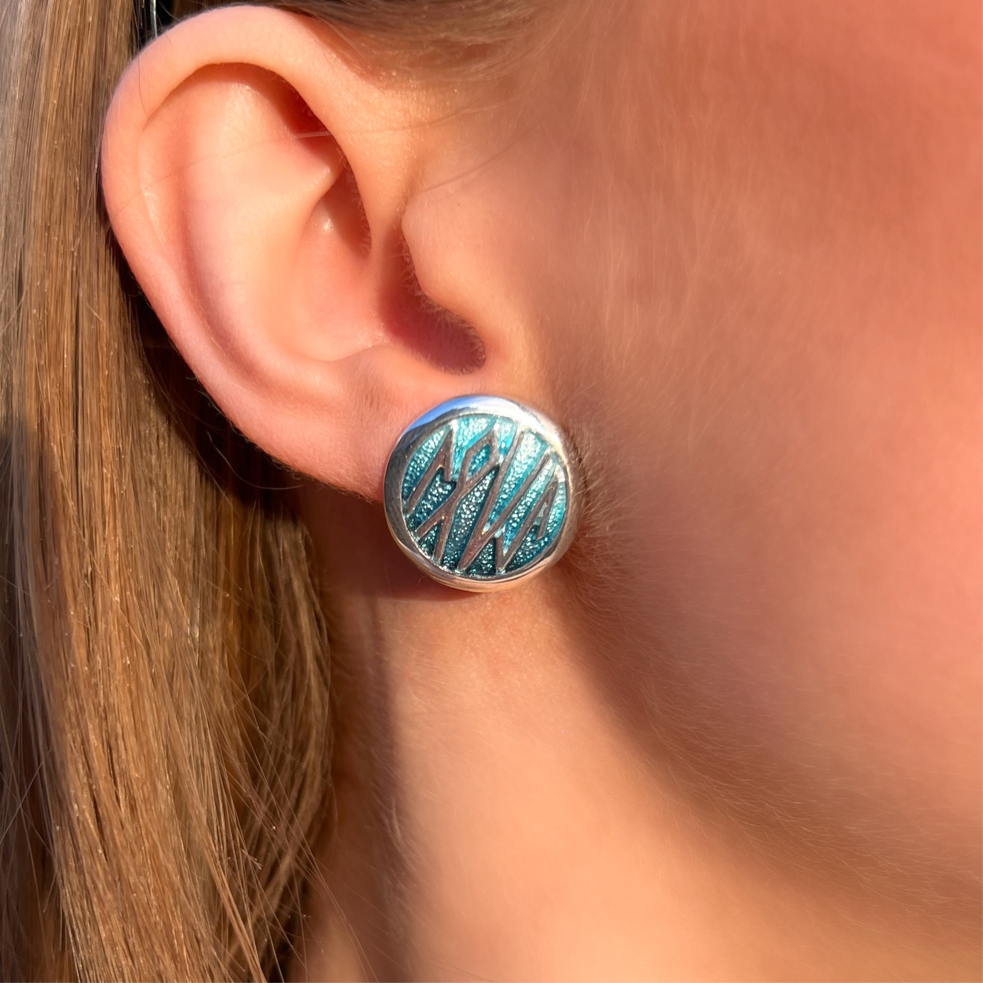 These Runic stud earrings in sterling silver feature silver runic text, reading ‘true love’, on a circular enamelled design. The earrings are hand-enamelled in 'Skaill' enamel in our Orkney workshop.