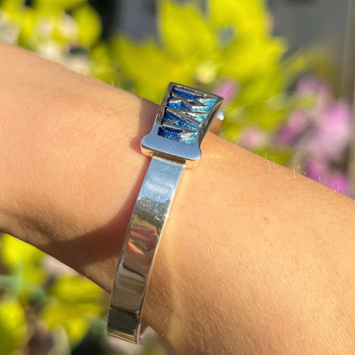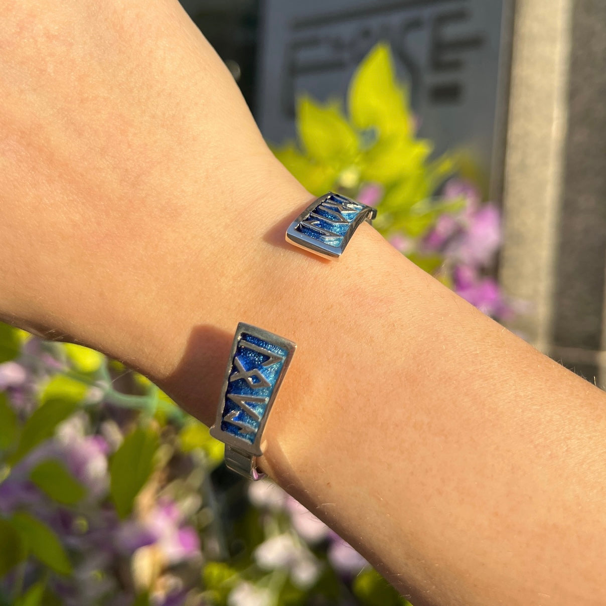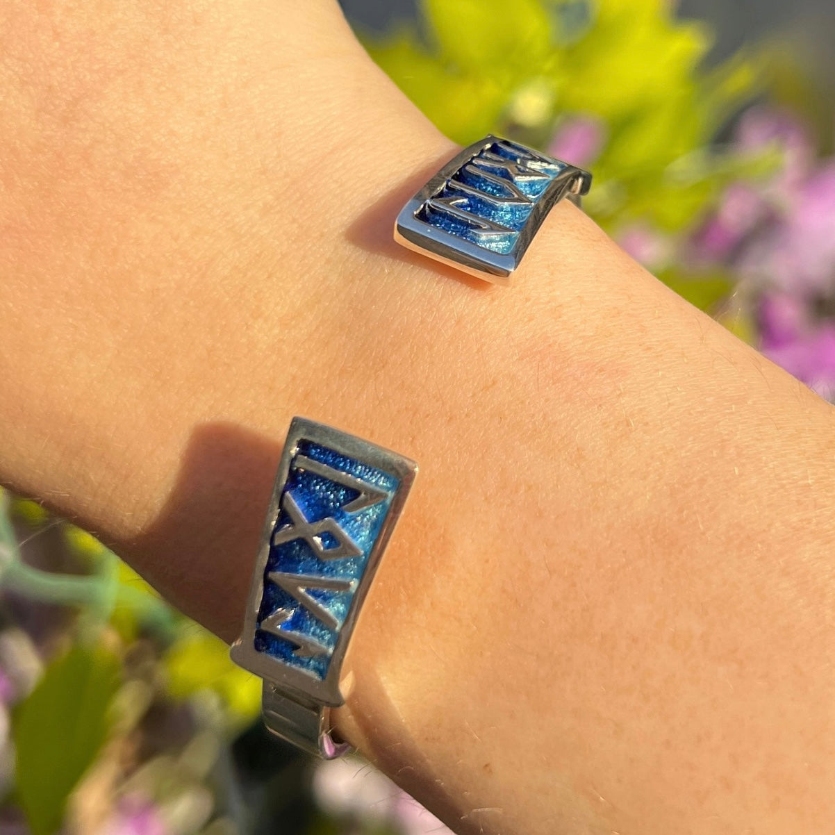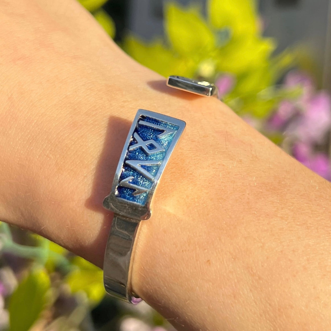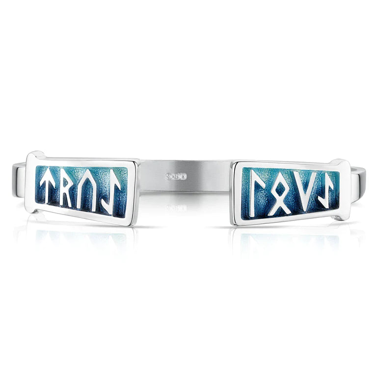 This Runic torque bangle in sterling silver is adorned with runic text on each end of the bangle. The runes read ‘true love’ and are beautifully enhanced by a hand-enamelled background of 'Skaill' enamel - one of Sheila Fleet’s own colourways.