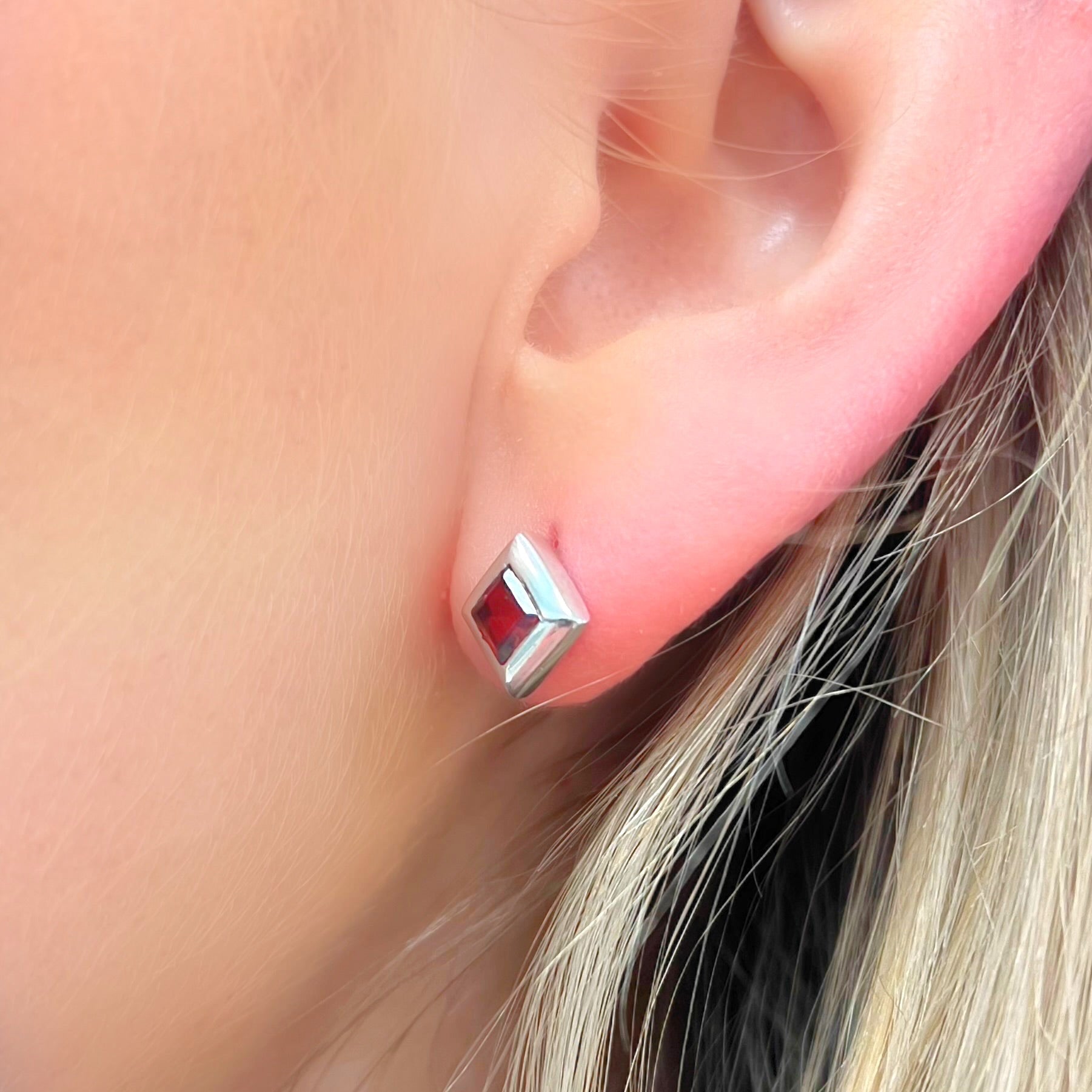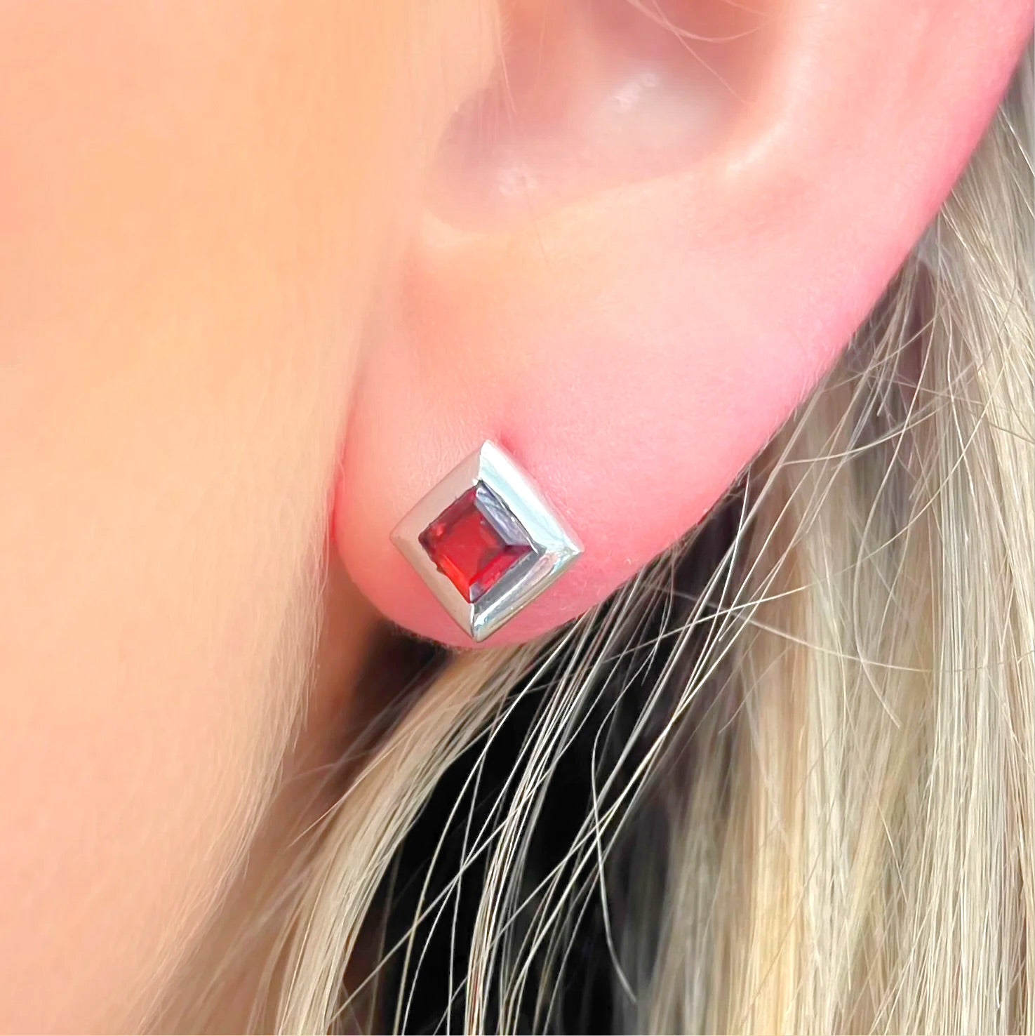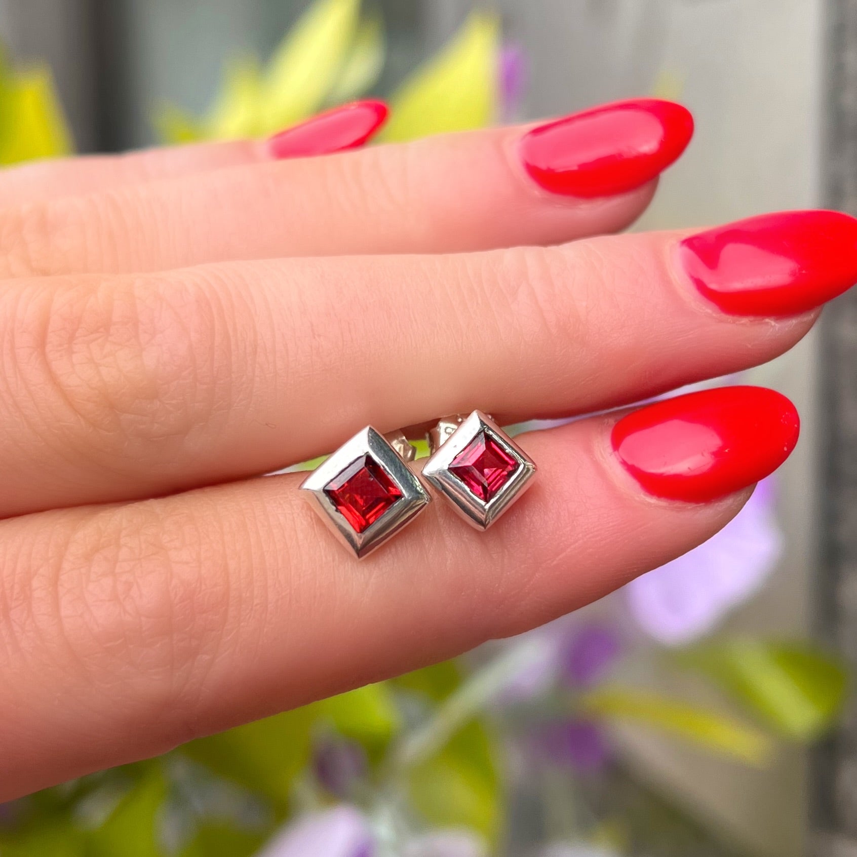 Made from bright sterling silver, these earrings feature vibrant princess-cut garnets bezel-set into a simple stud style - perfect for everyday wear.