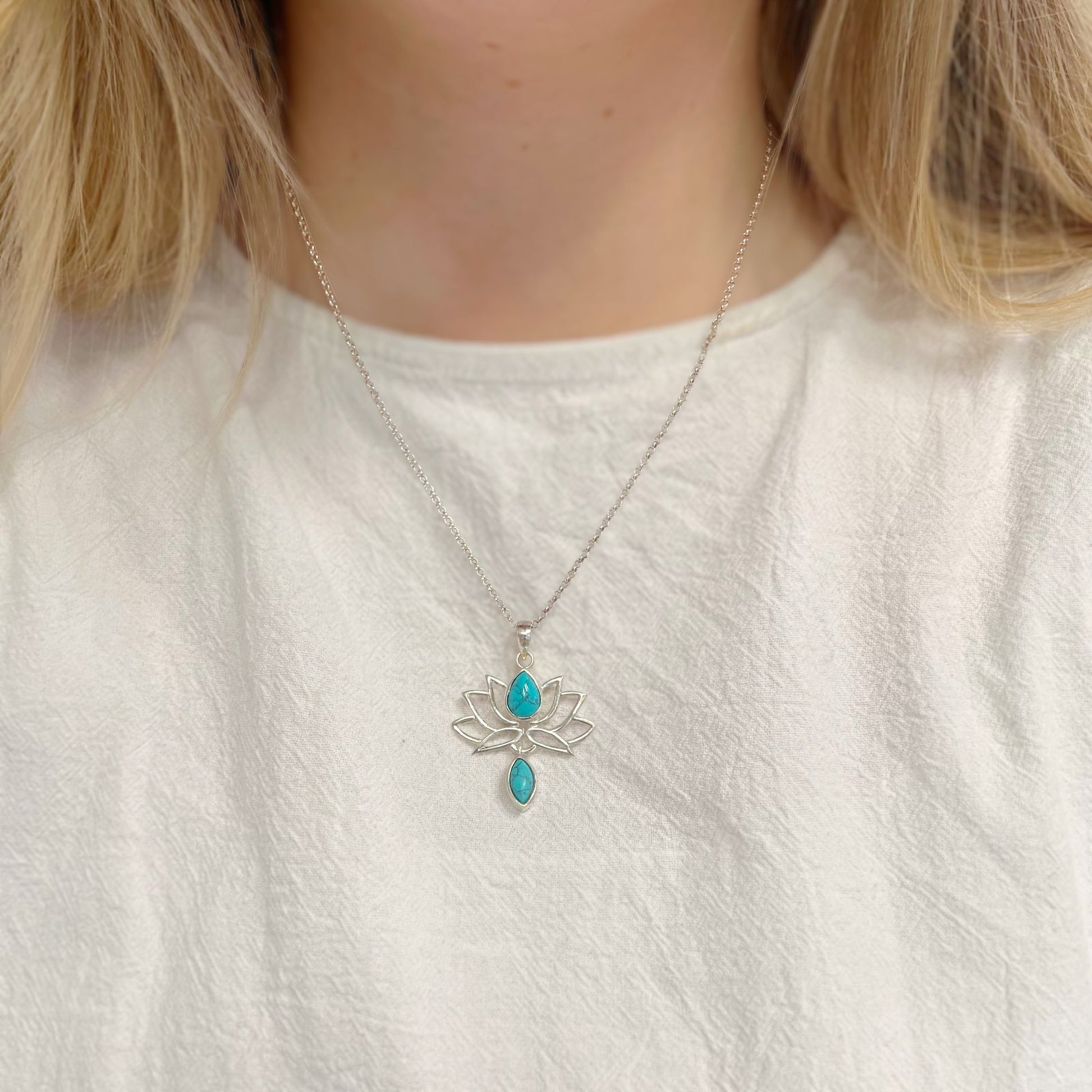 This unusual pendant features a lotus flower beautifully crafted in sterling silver, with a pear-shaped turquoise at its heart and a marquise turquoise drop for added intrigue.