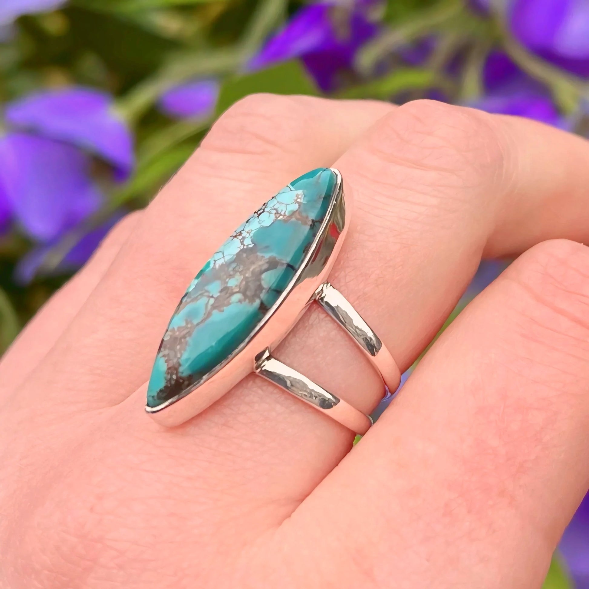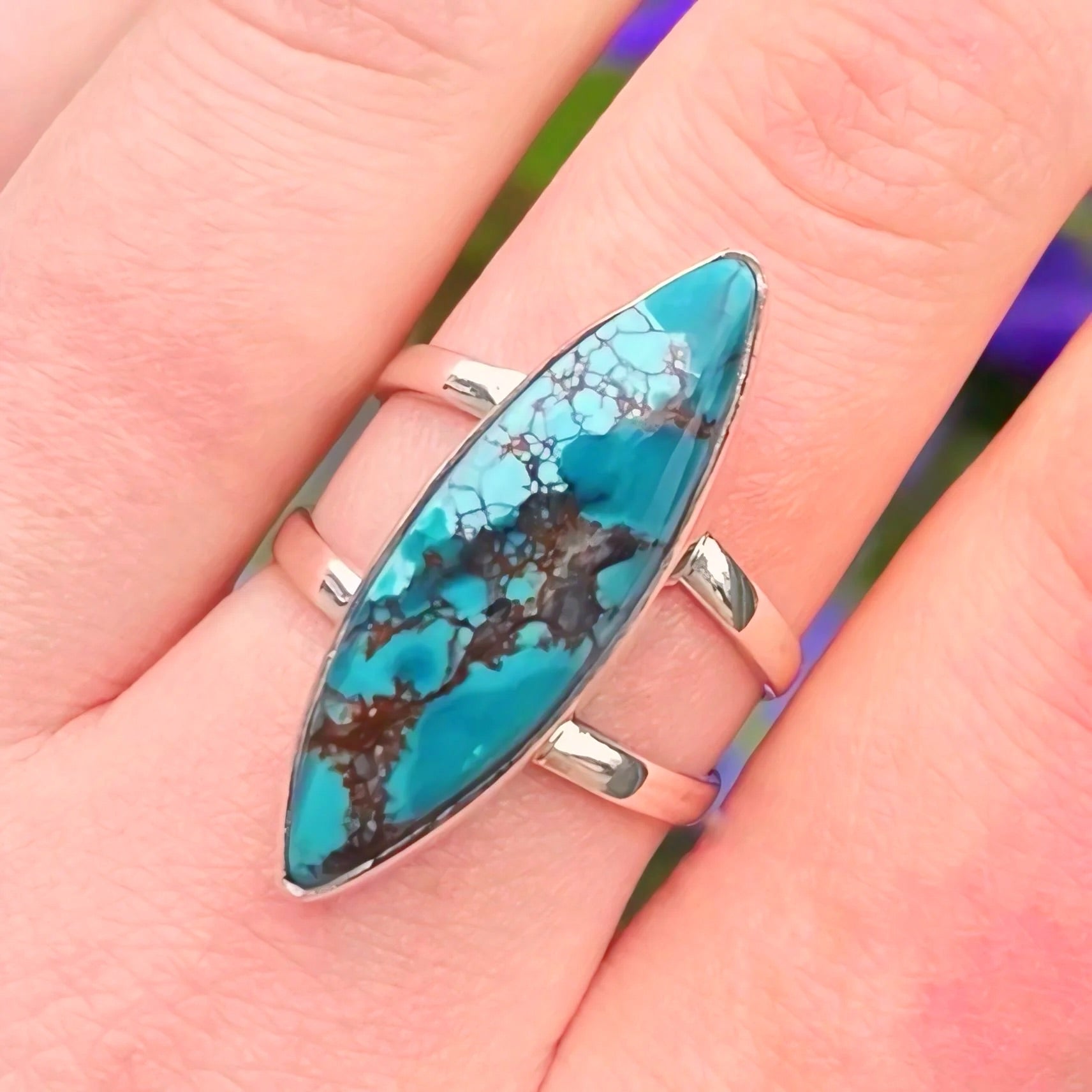 This unique ring features a marquise shaped blue bezel set turquoise with a double band feature, all in sterling silver.