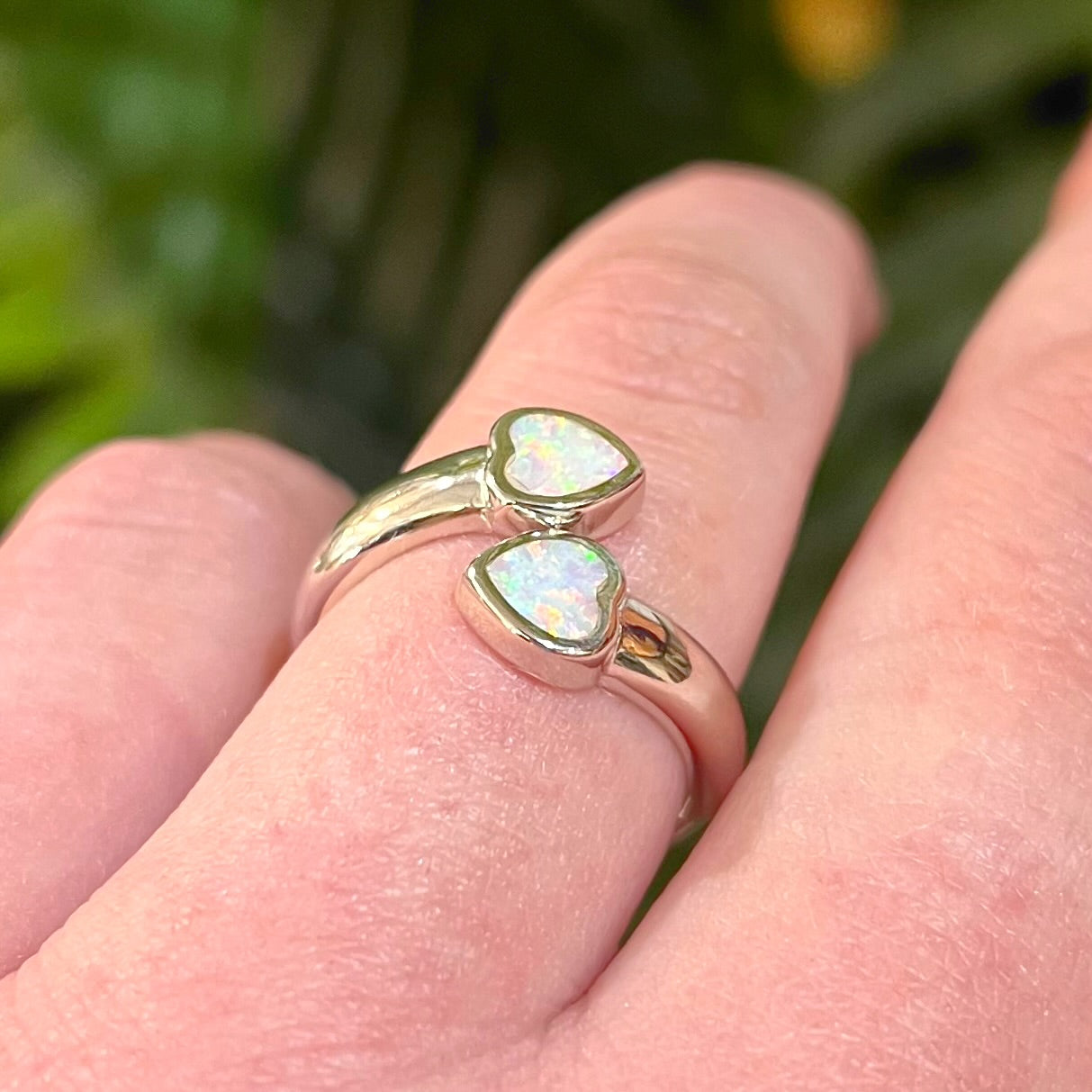 Sterling Silver Two Hearts White Opal Ring - Adjustable Size