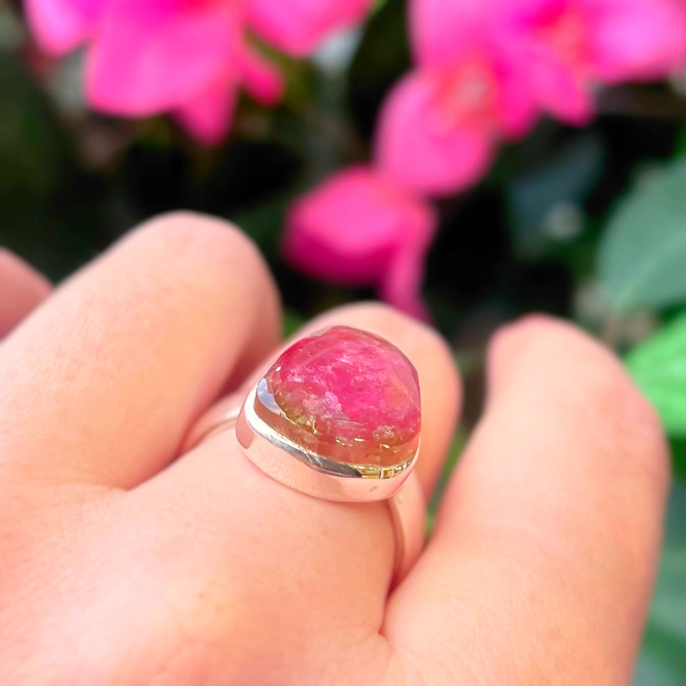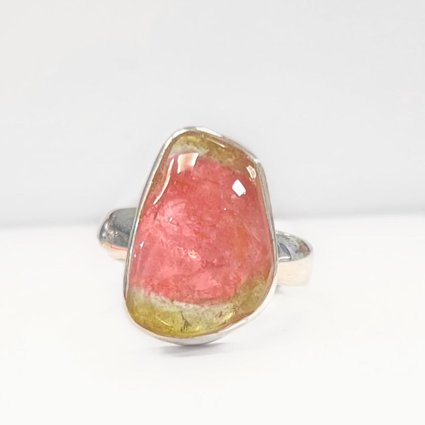 A watermelon tourmaline in the shape of a watermelon slice — this lovely ring features a bi-coloured pink and green tourmaline wedge, bezel-set in bright sterling silver, perfect for everyday wear.