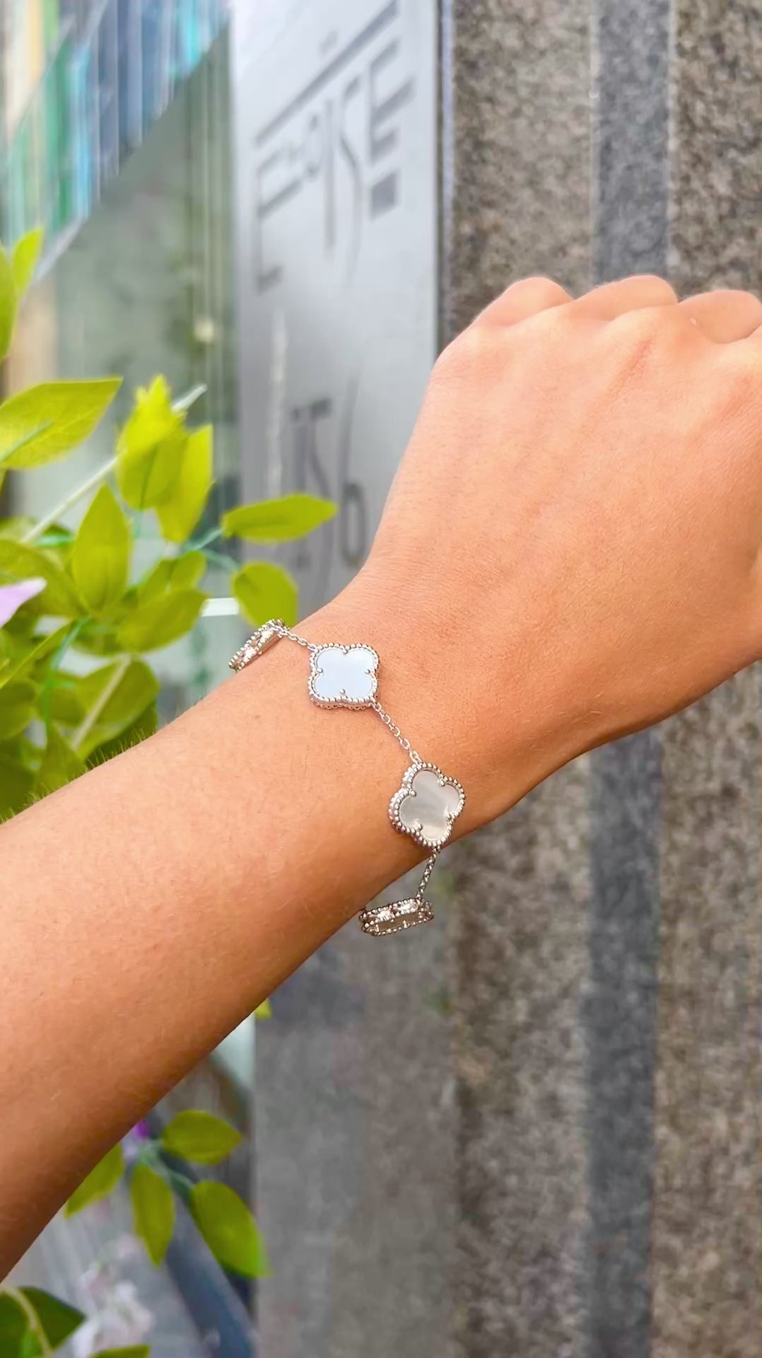 This sterling silver bracelet features clover shaped mother of pearl in a repeating elegant design.
