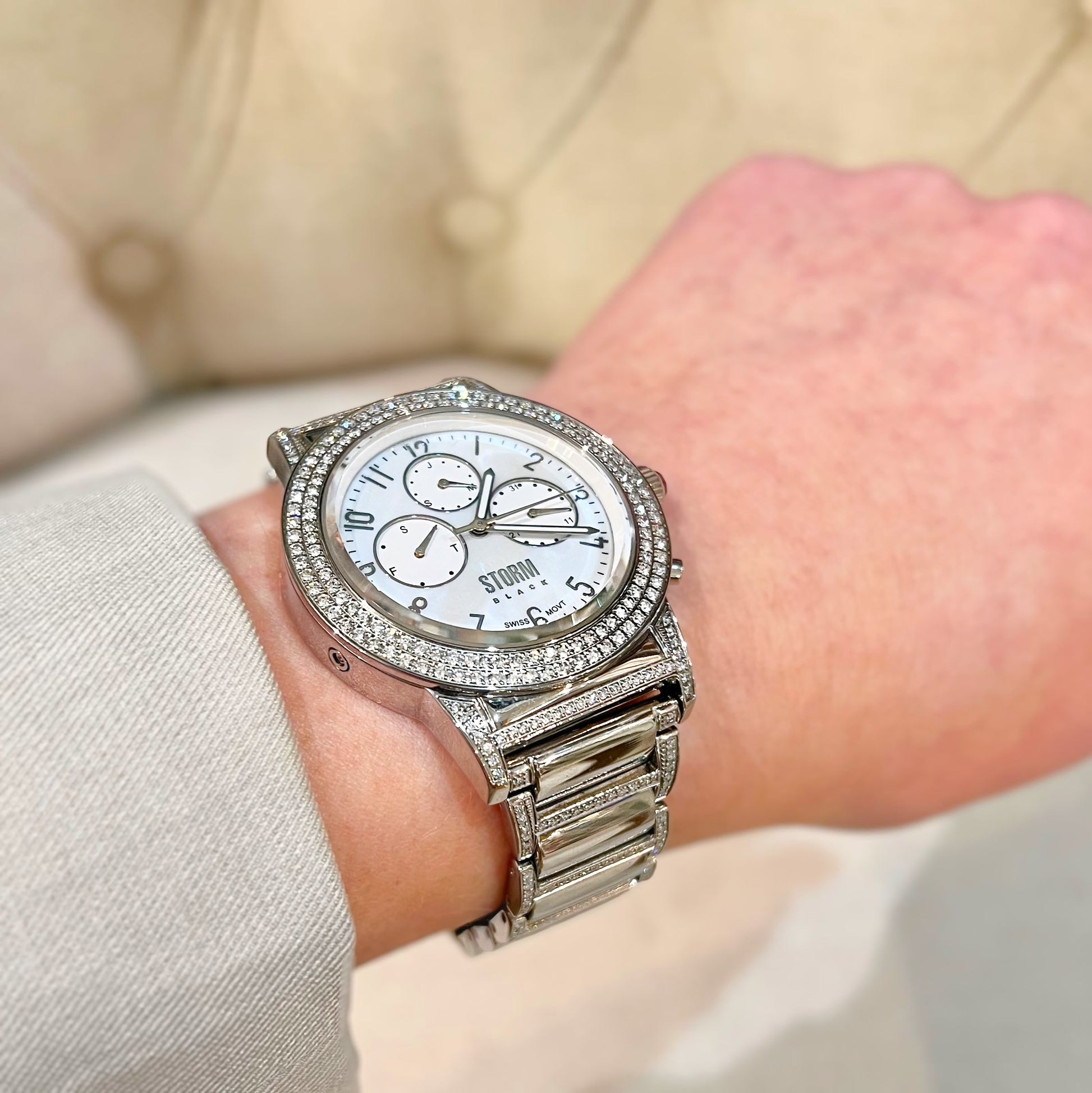 A luxurious stainless steel timepiece from the exclusive STORM Black Collection, the Diamond Elody showcases a stunning mother-of-pearl dial paired with a sparkling natural diamond-set bezel for exceptional brilliance.