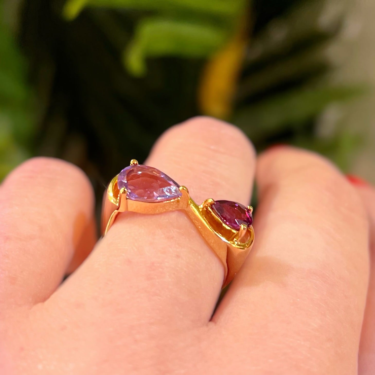Set with richly toned garnet- and amethyst-coloured cubic zirconia, the contrasting dark red & light purple fluid design creates a striking balance of depth, colour, and contemporary elegance.