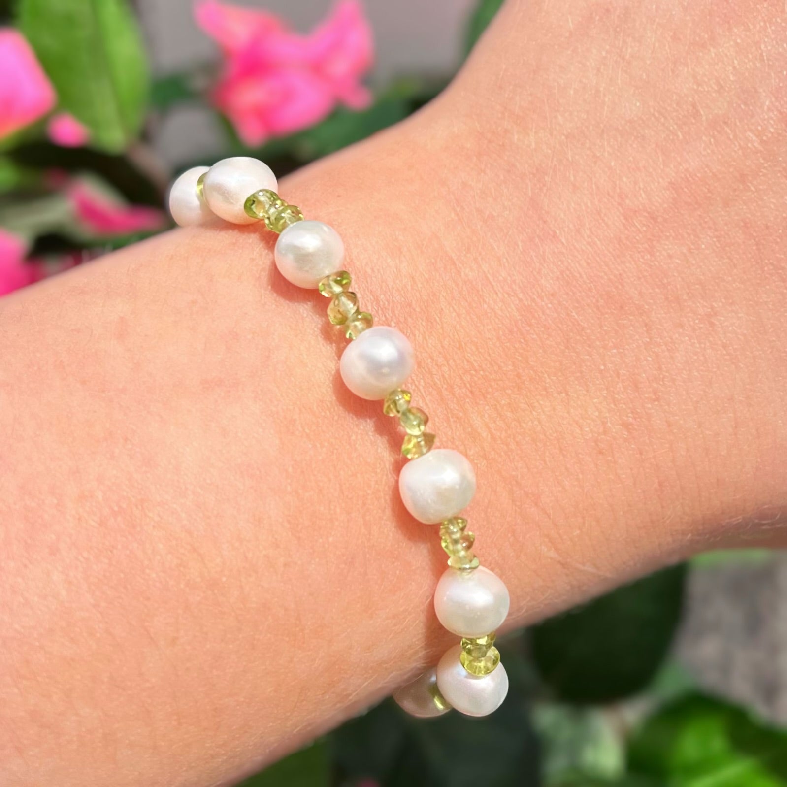Handmade by our very own Louise, this beautiful bracelet features alternating real pearl and peridot beads, expertly strung and finished with a simple sterling silver lobster clasp.
