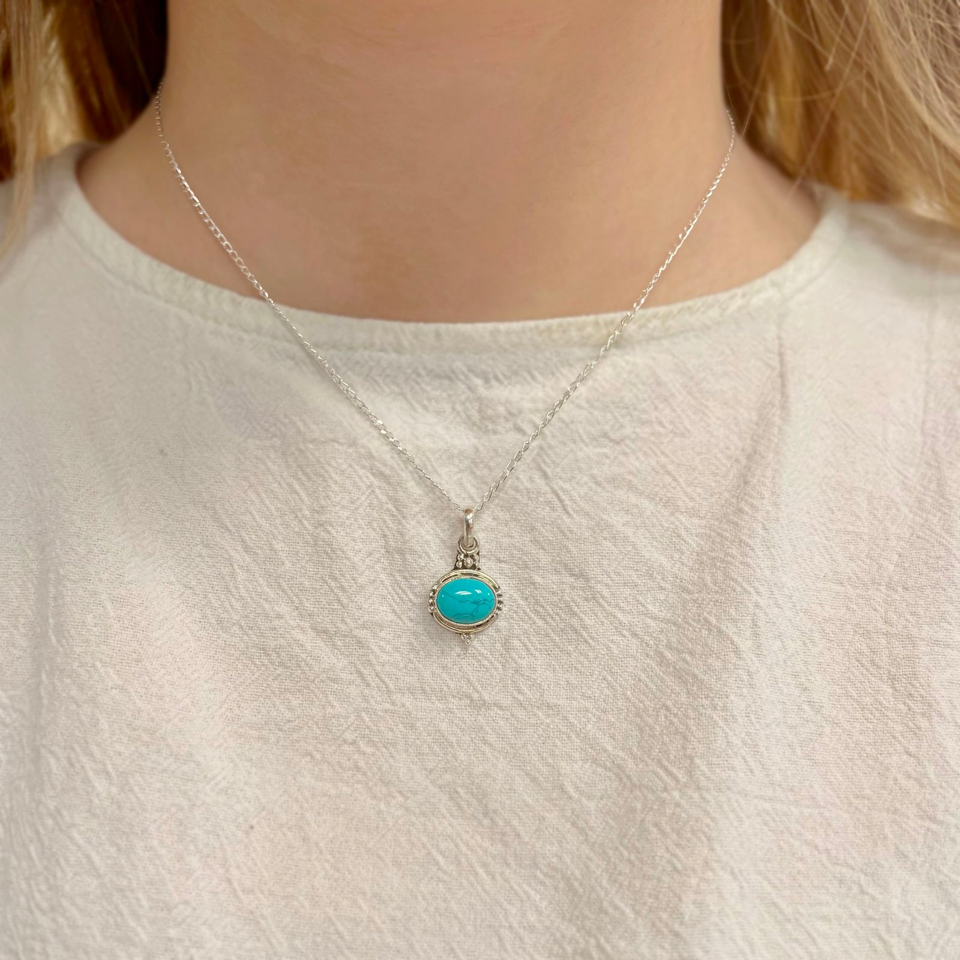 Made in bright sterling silver, this sweet necklace features an oval turquoise set east-to-west into an unusual, detailed design.