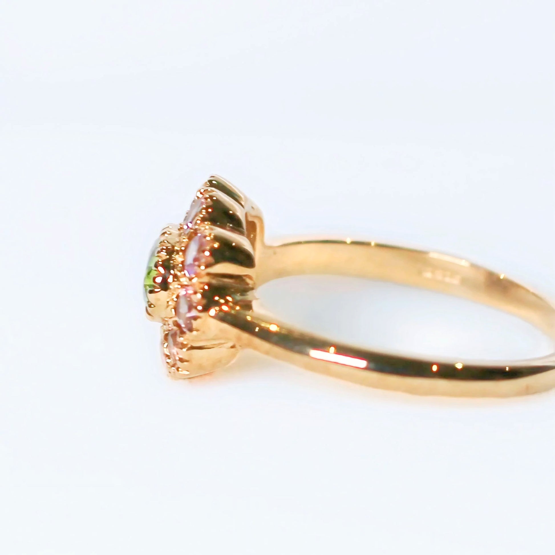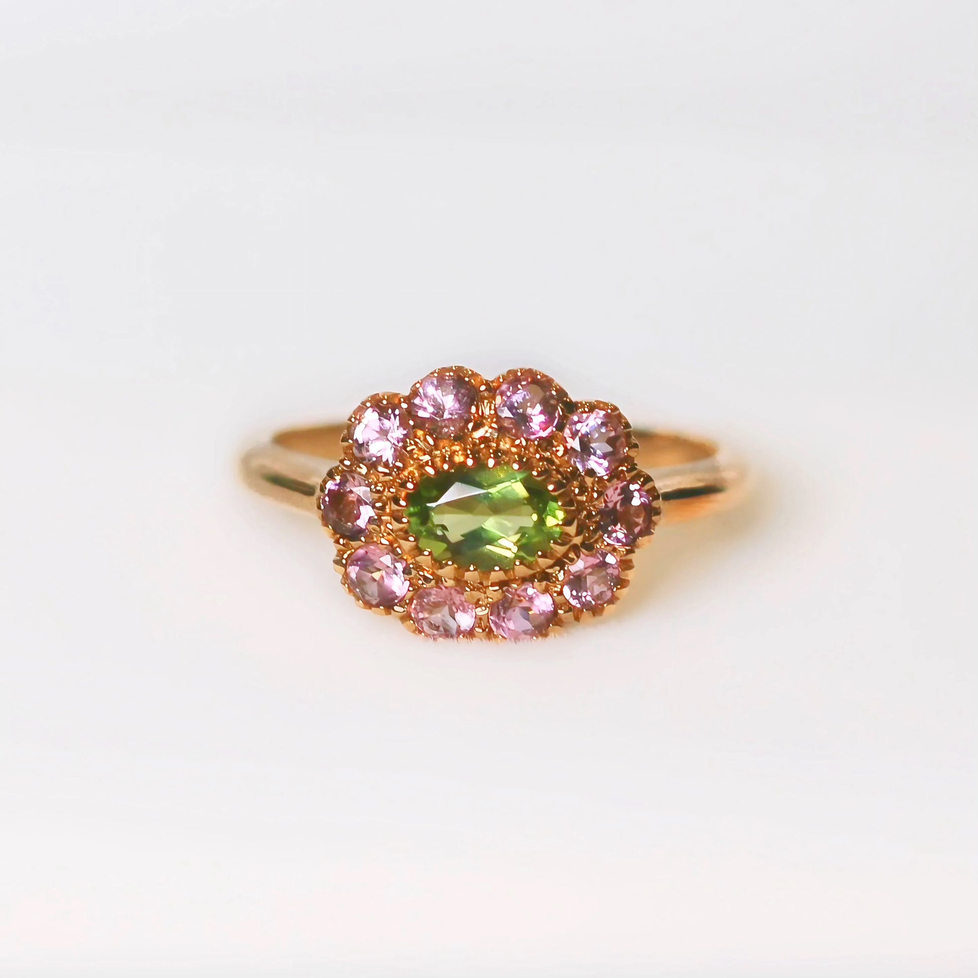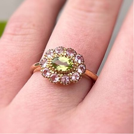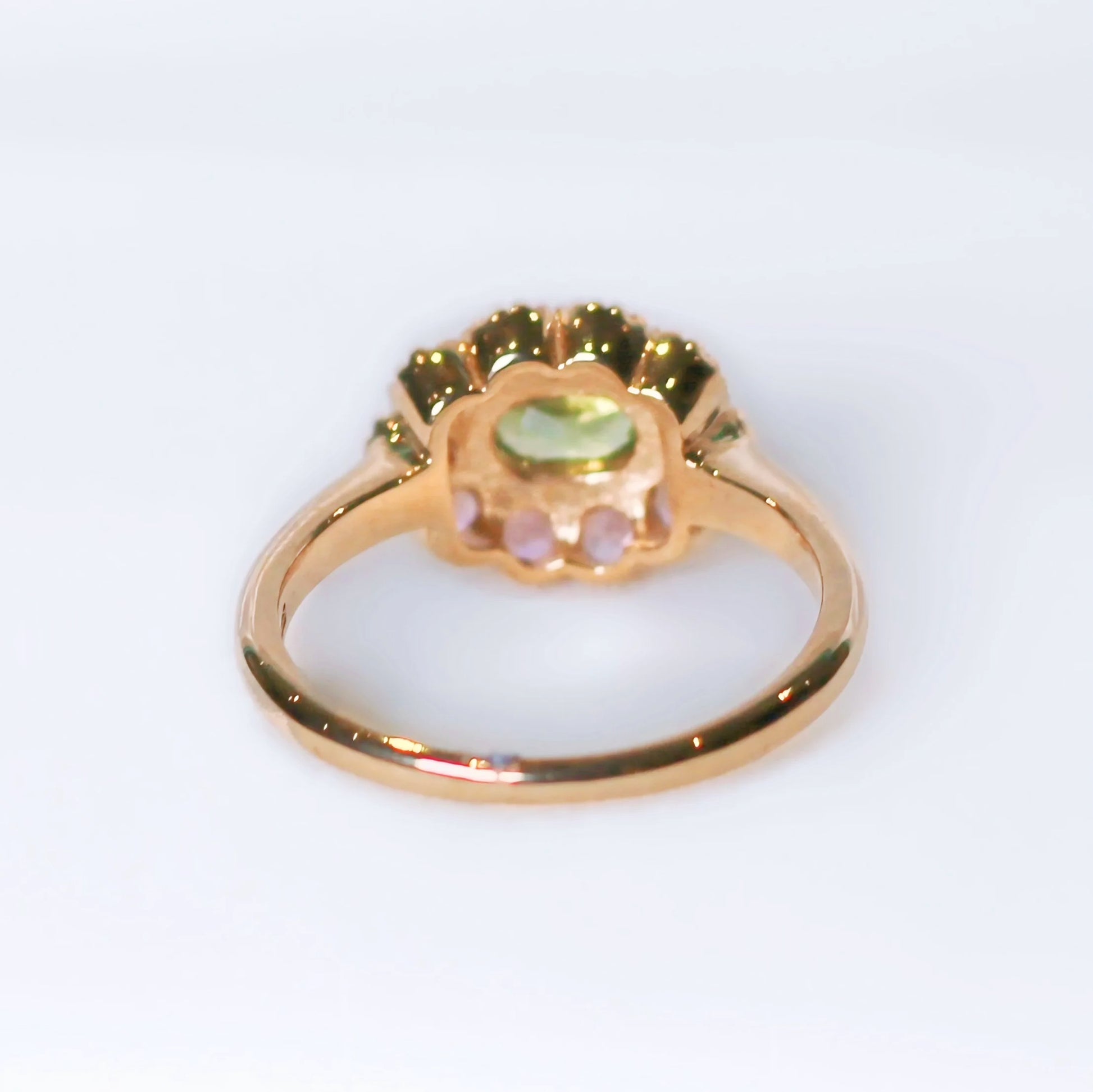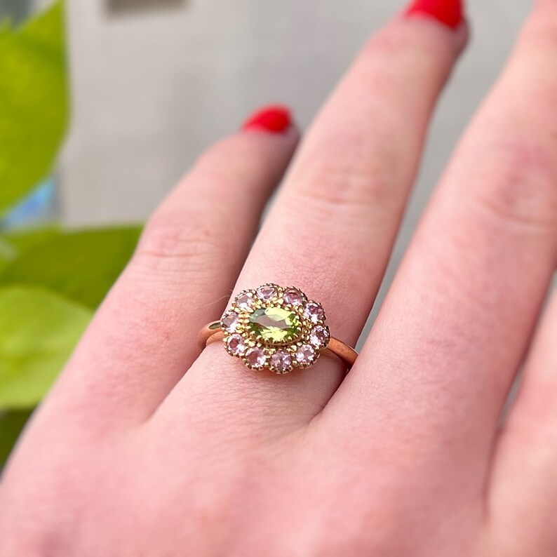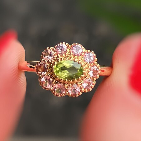 This sweet 9ct yellow gold ring embodies Victorian elegance with blushing tones of sweet pink tourmaline and fresh green peridot gemstones, expertly set into a feminine floral cluster style.