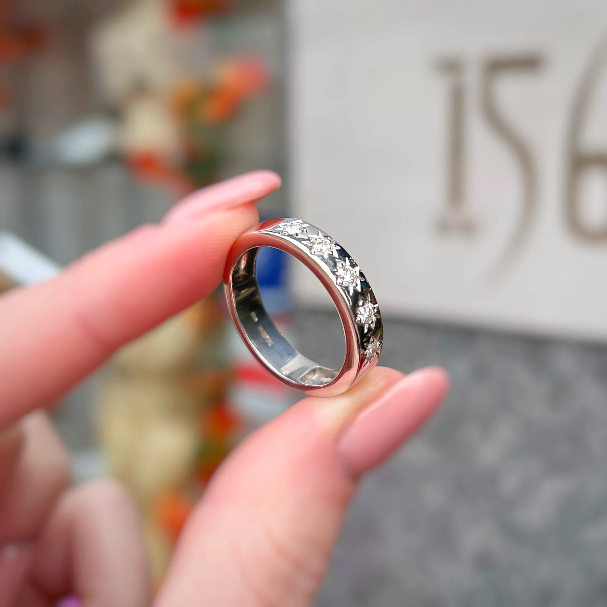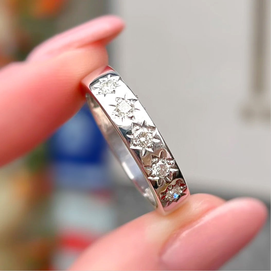 This sweet Diamond band packs a punch. Made in 18ct White Gold this ring showcases five, round-cut, Diamonds. Each one has been elaborately star-set, flush into the band to give a simple yet sparkling finish. This ring would make an excellent everyday ring or wedding band if you can't resist glitz and glamour.