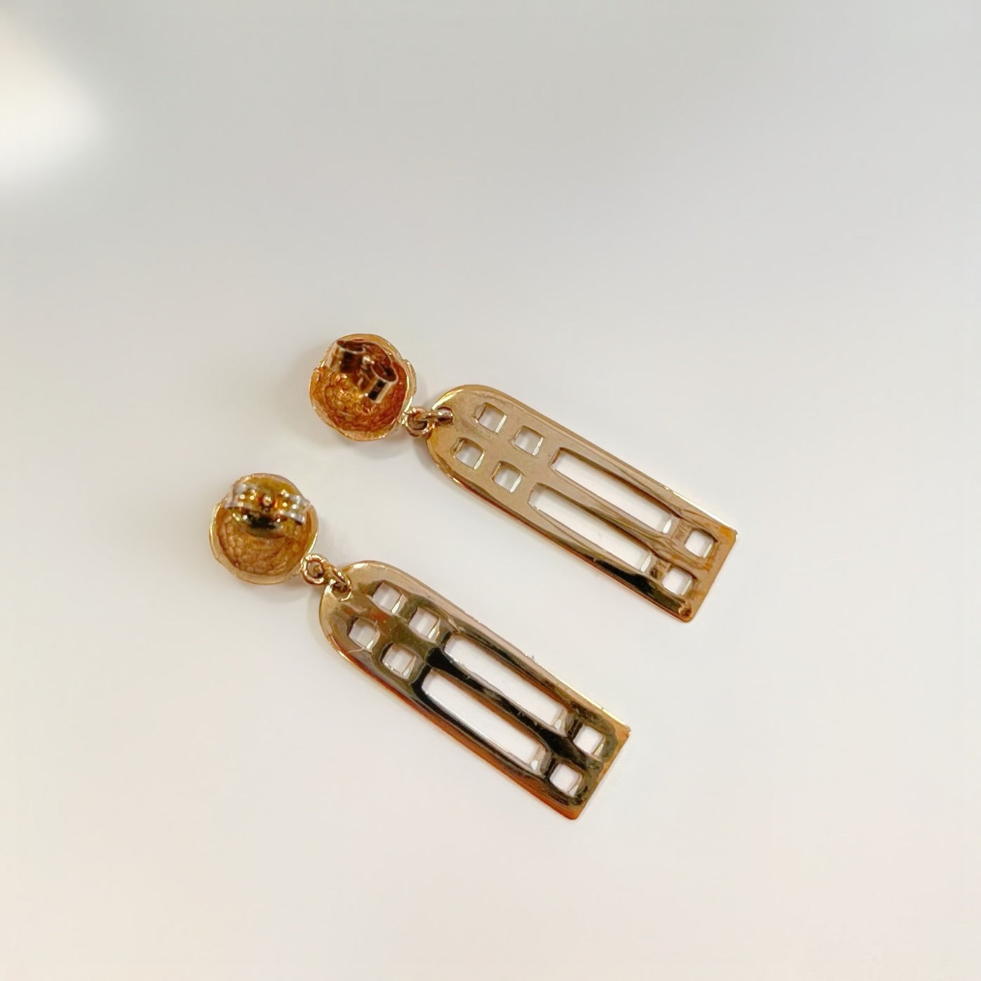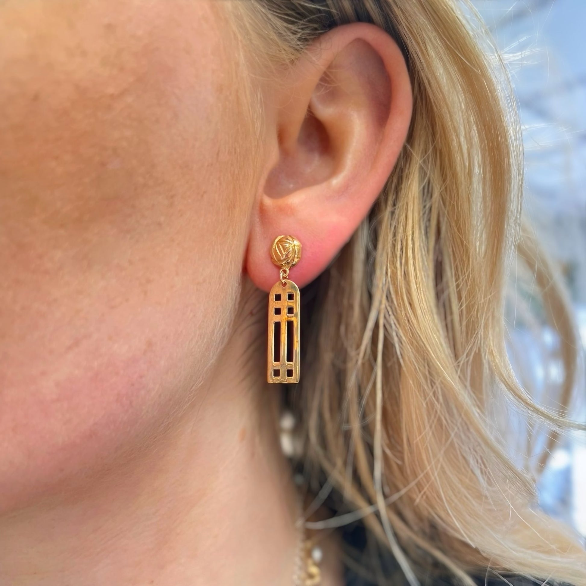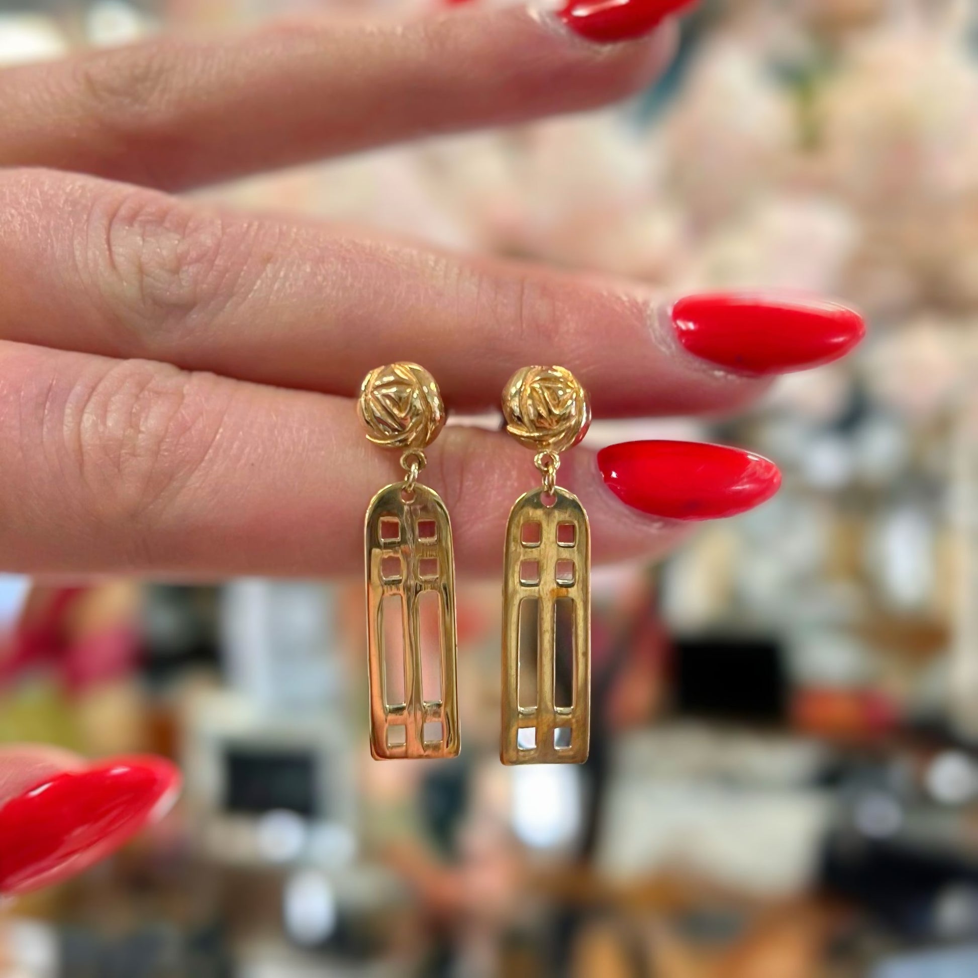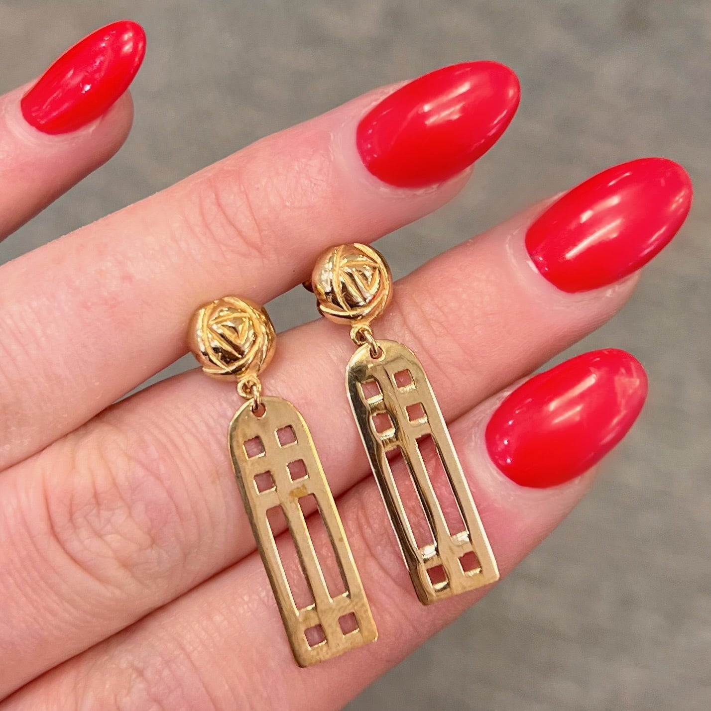 Vintage 9ct Yellow Gold Charles Rennie Mackintosh Inspired Panel Drop Earrings