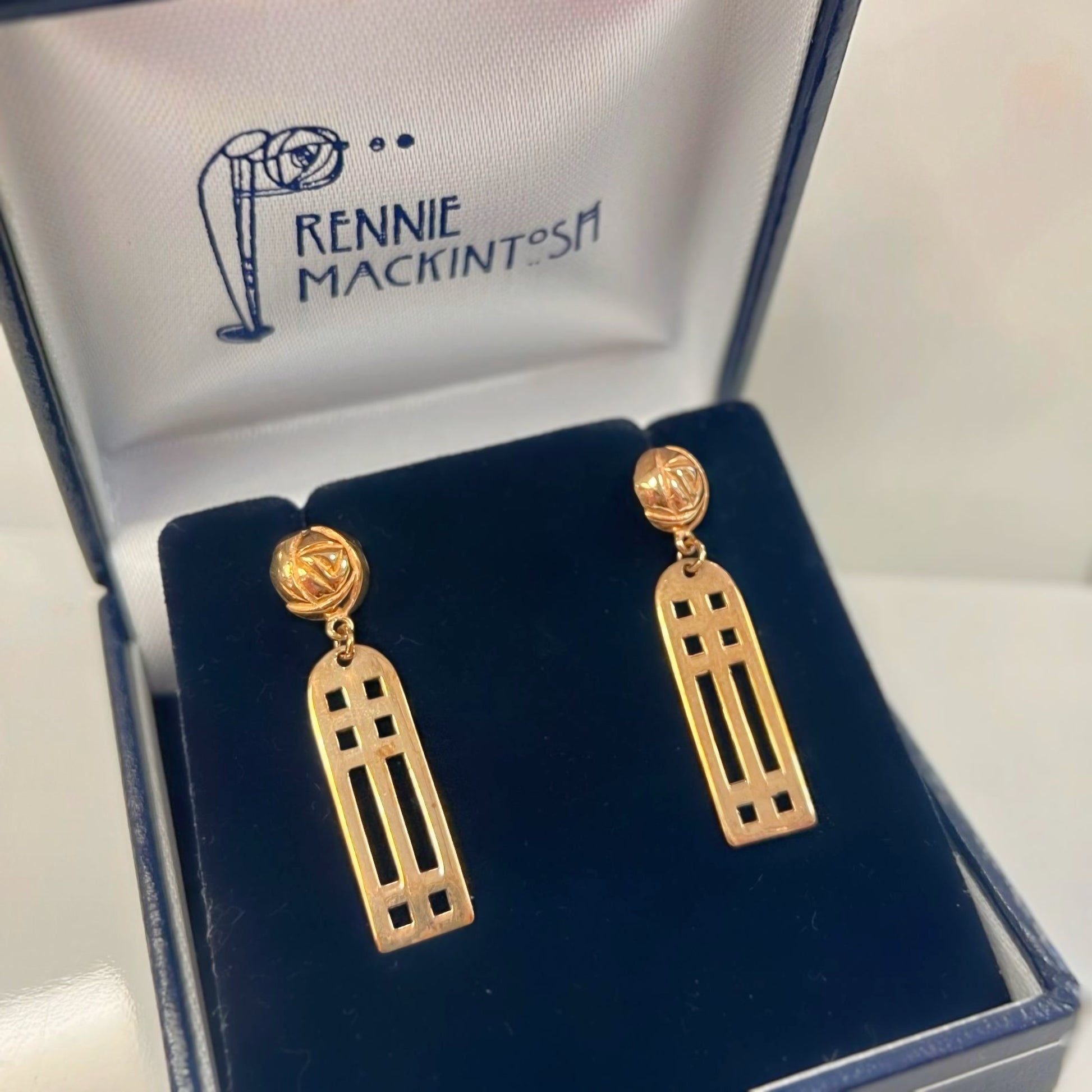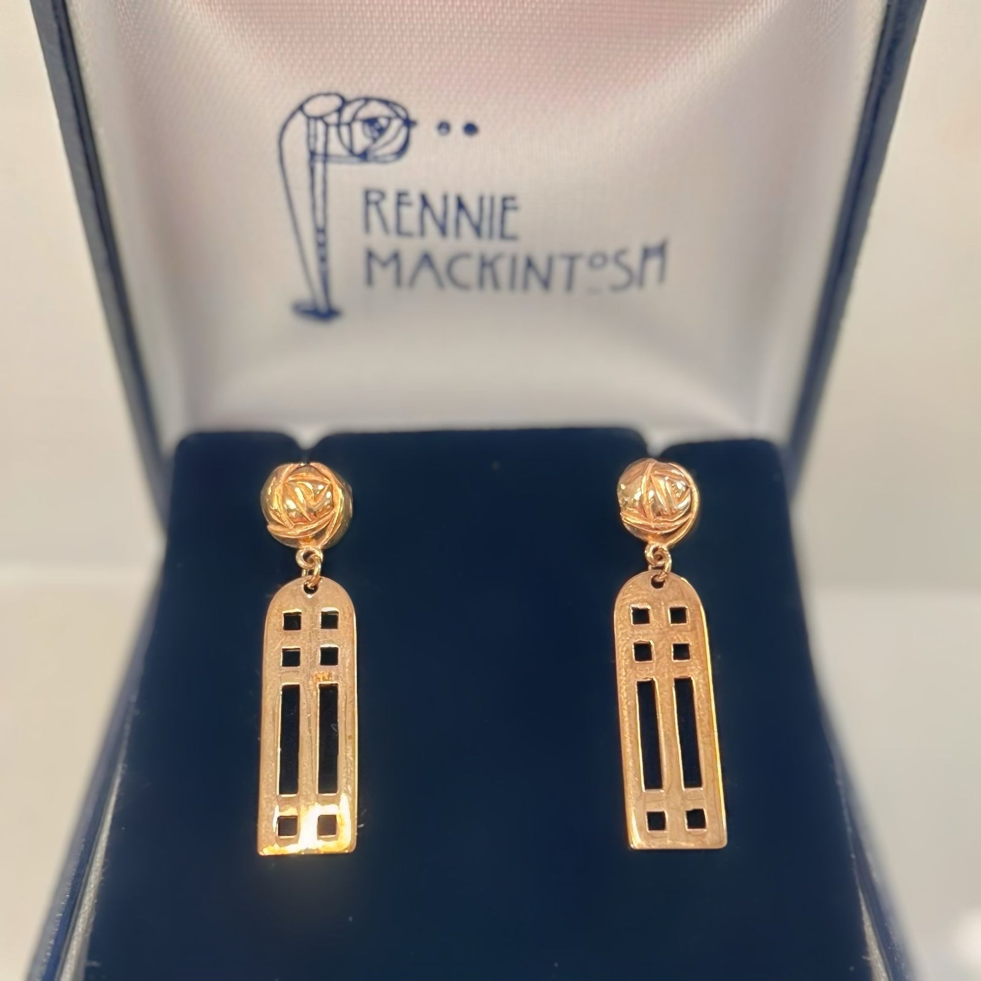 These drop earrings are stunning! Made from 9ct yellow gold, they feature classic structured shapes, artistically composed to mimic Mackintosh's iconic glass panels. What makes these so special is the beautifully detailed rose motif from which the drop is suspended.