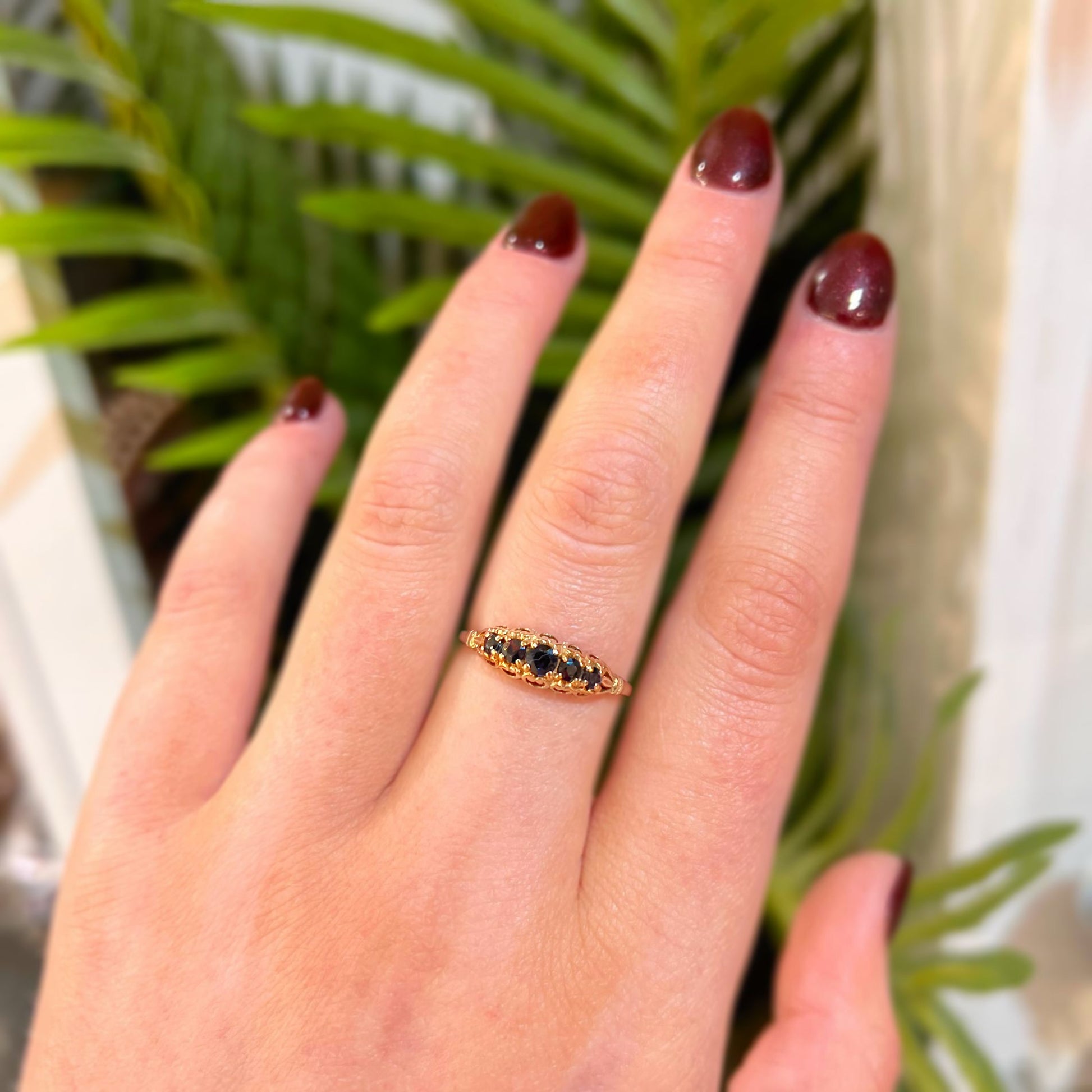 This lovely ring is a vintage piece, crafted in the antique Edwardian style and featuring five deep blue sapphires of graduating sizes, claw-set into an ornate design.