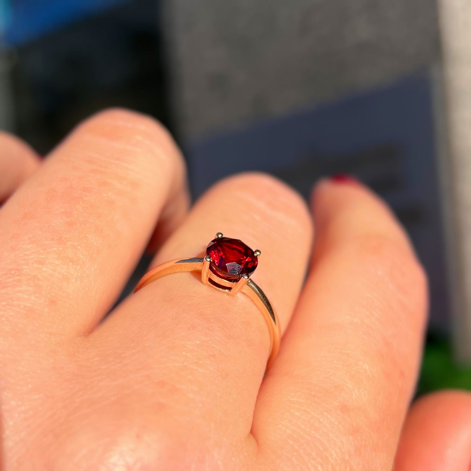 This ring puts all the focus on the beautiful stone. It features a deep, regal red garnet, expertly claw-set into a simple 9ct yellow gold solitaire style, perfect for everyday wear.