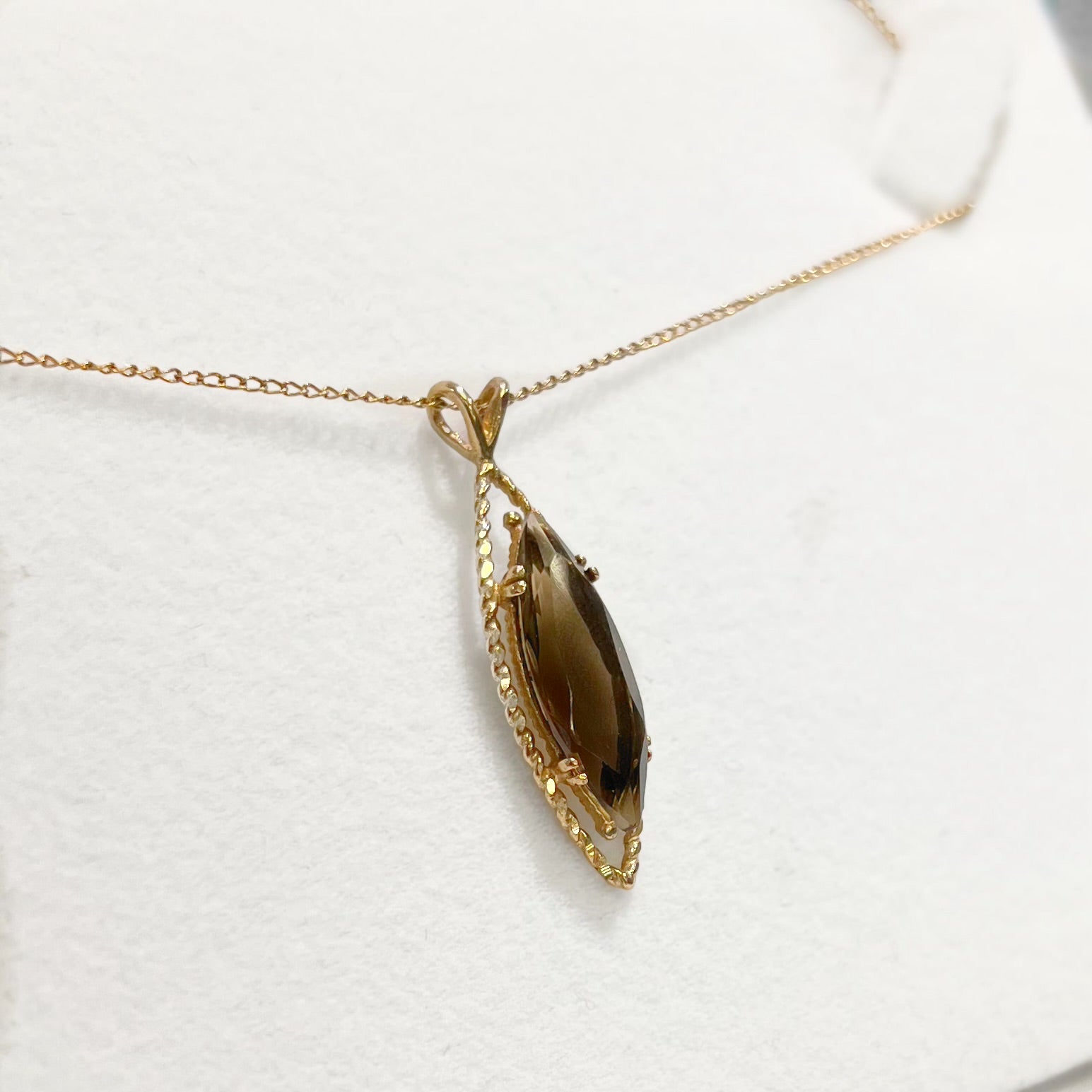 One for the vintage jewellery fanatics! This gorgeous necklace features a moody, marquise-cut smoky topaz, expertly claw-set with double prongs into a diamond-cut patterned 9ct yellow gold setting.