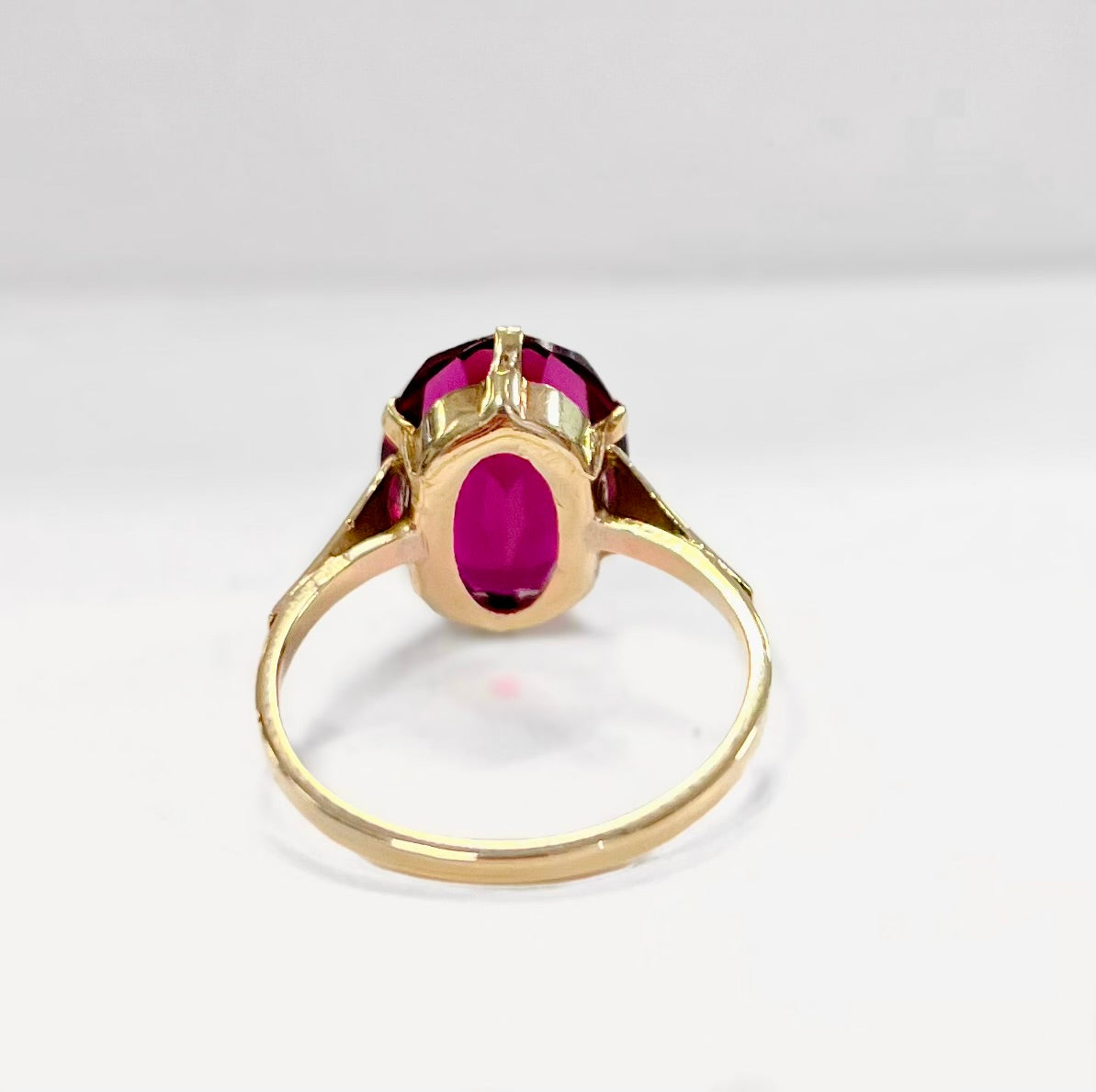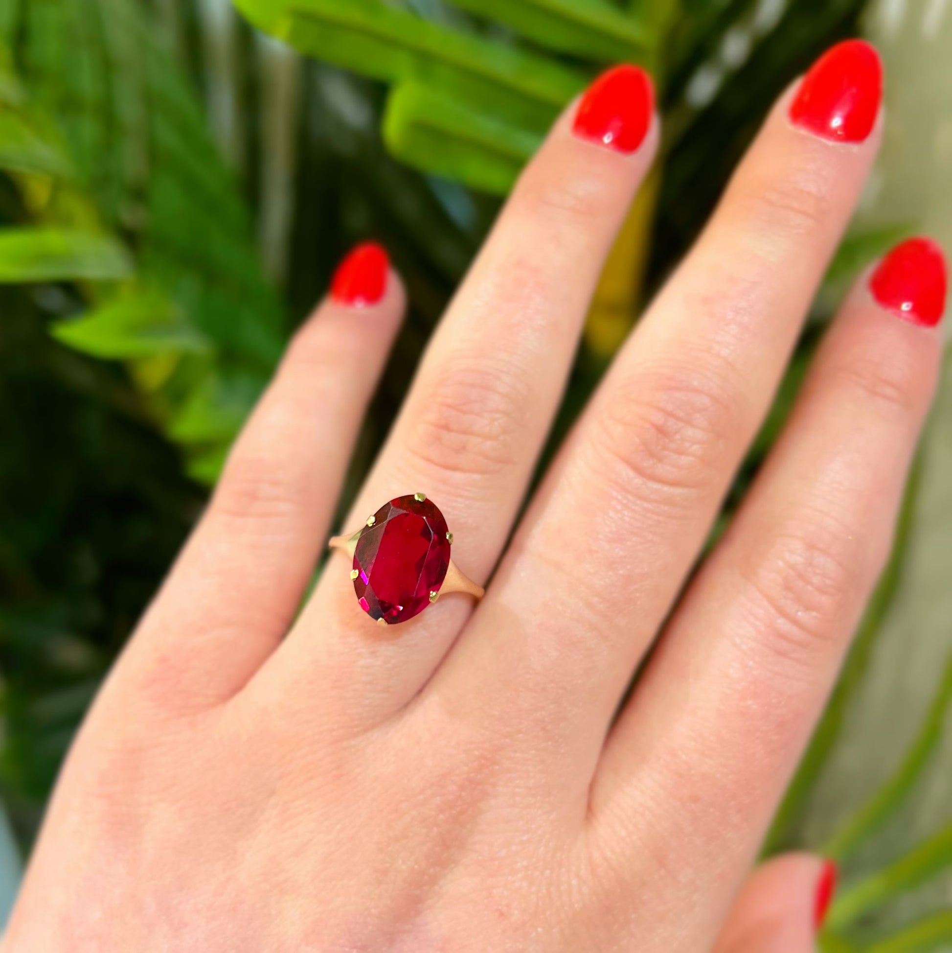 This ring is a true hidden gem! It features a lovely elongated oval-cut ruby paste stone, expertly claw-set into a classic 9ct yellow gold solitaire-style cocktail ring, with tapered shoulders that enhance the presence of such a large stone.