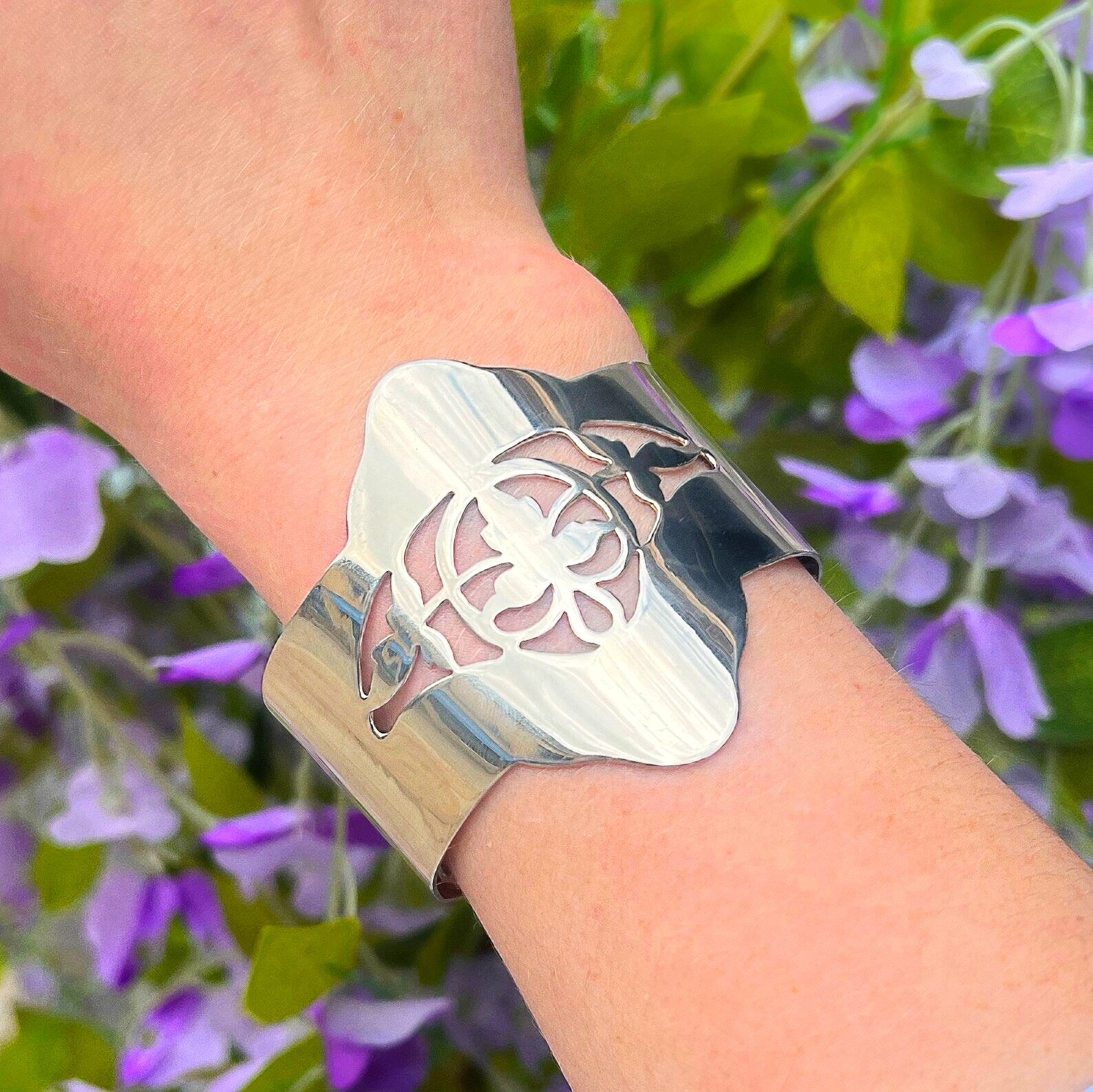 This gorgeous cuff has been made in sterling silver and features glorious, pierced out detailing depicting a classic, nature inspired, art nouveau motif.