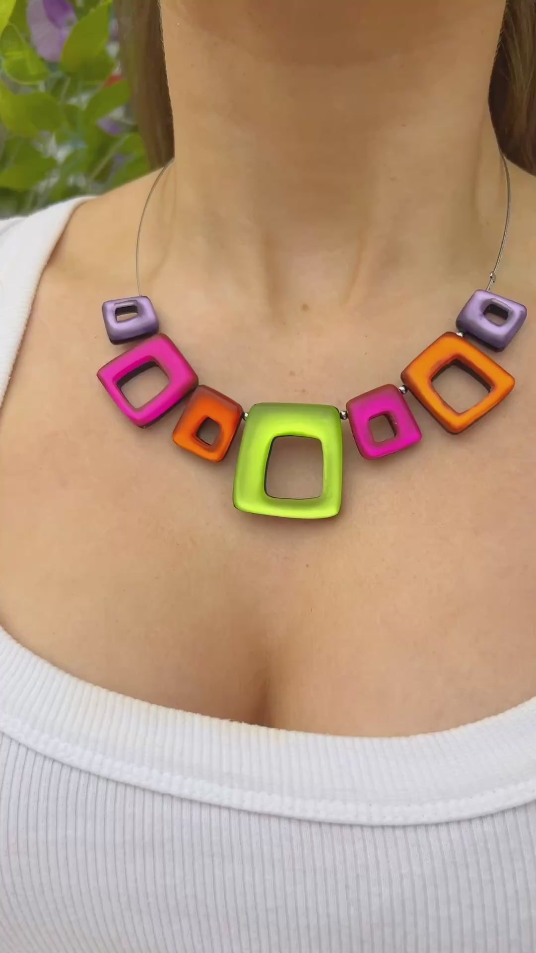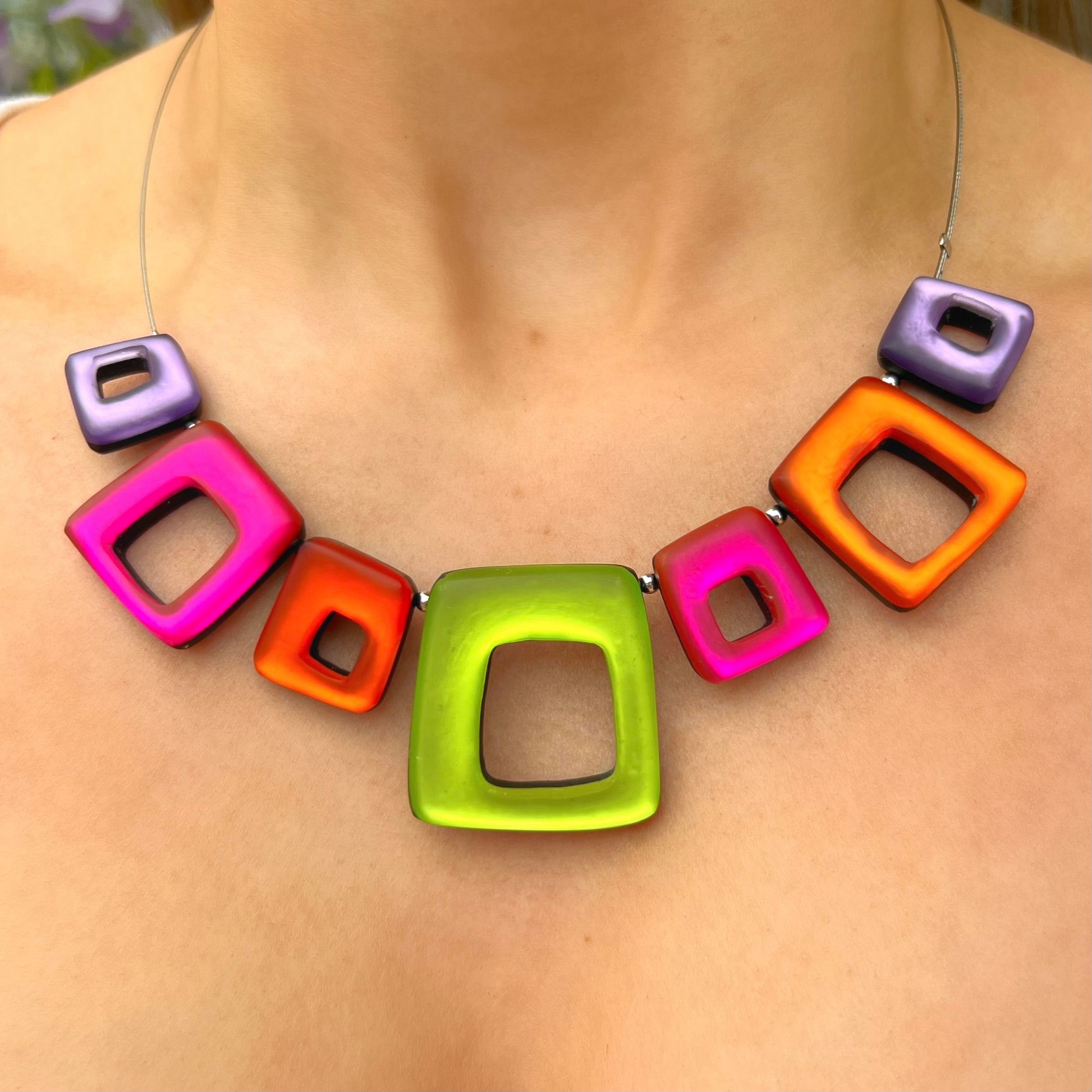 ‘Watch This Space’ Sherbet Pink, Purple, Green & Orange Square Necklace